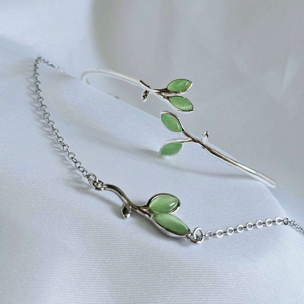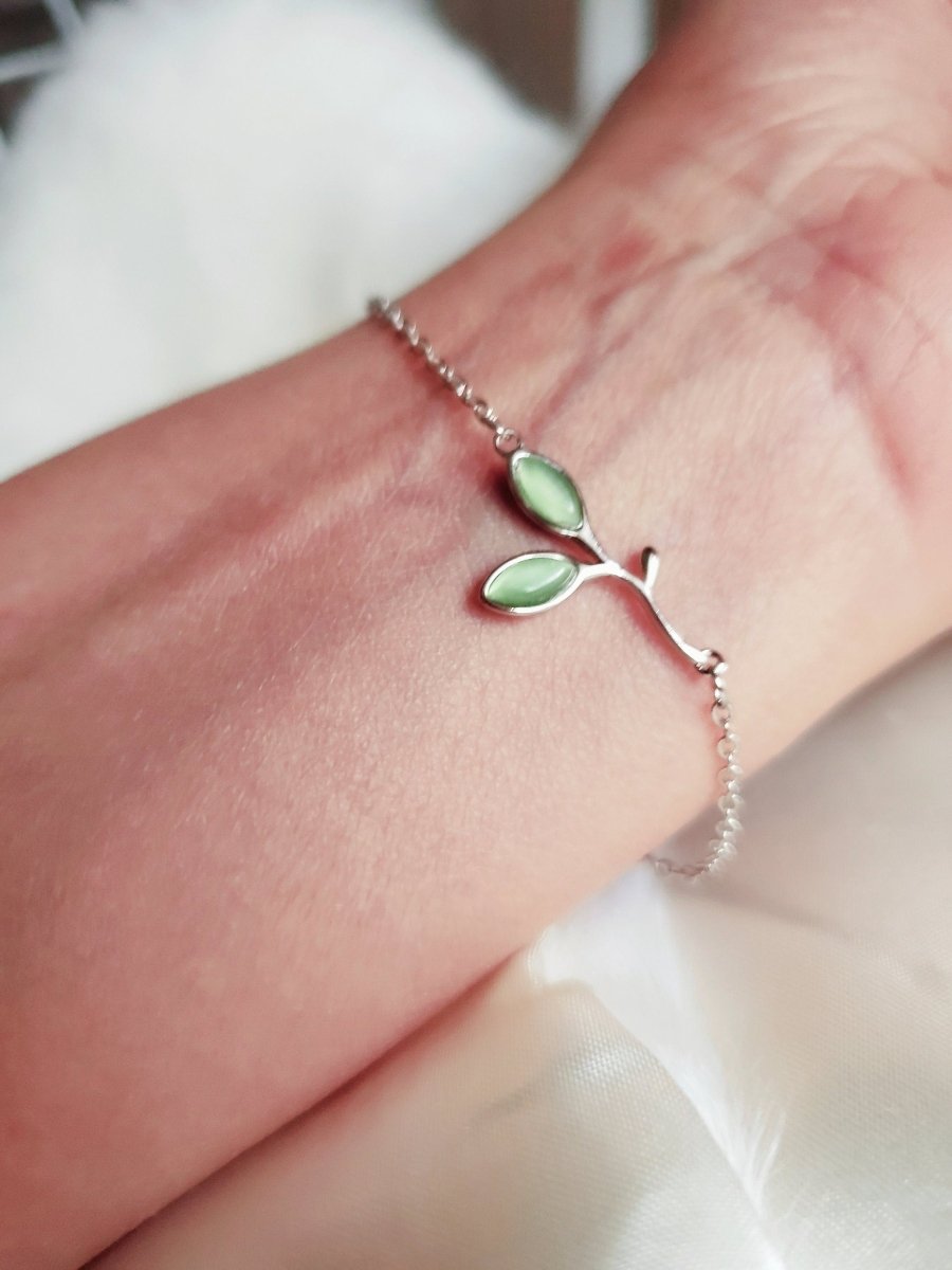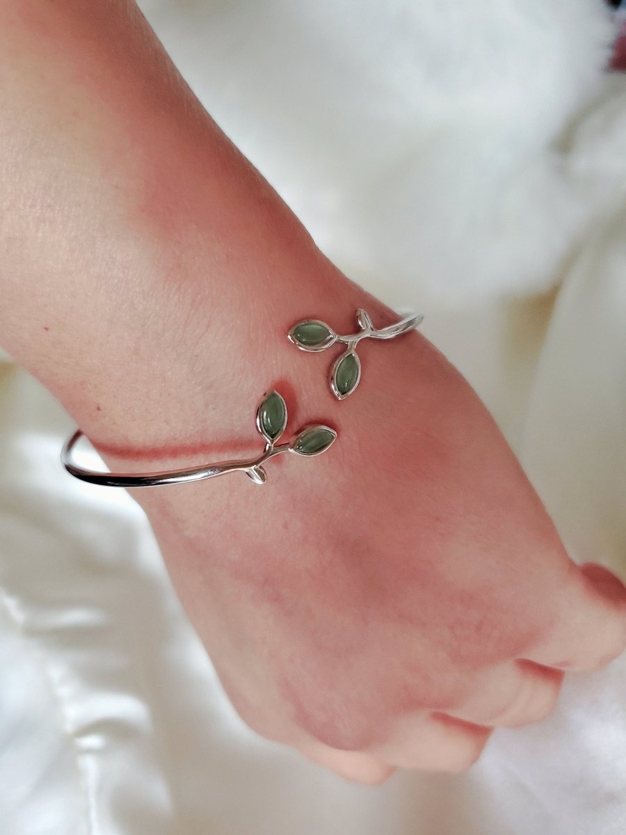 Beautiful, delicate green stone leaves on a dainty super thin yet sturdy cuff bracelet. This gorgeous floral piece is made with love, and is going to add that extra sparkle to your outfit; just slip this open-ended cuff onto your wrist and adjust with a gentle bend to your liking and get loaded with compliments!