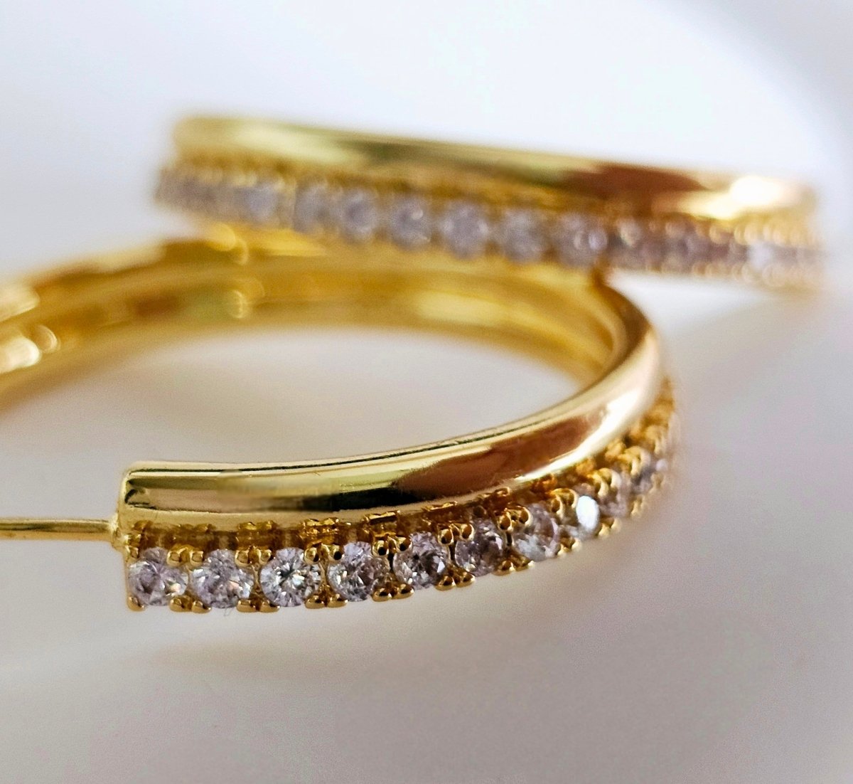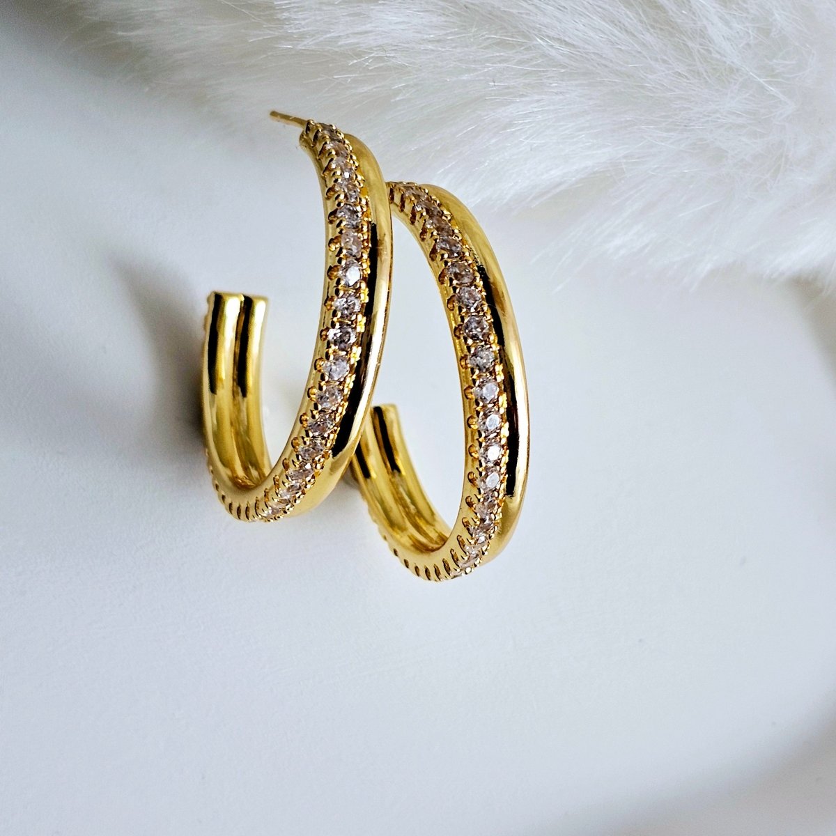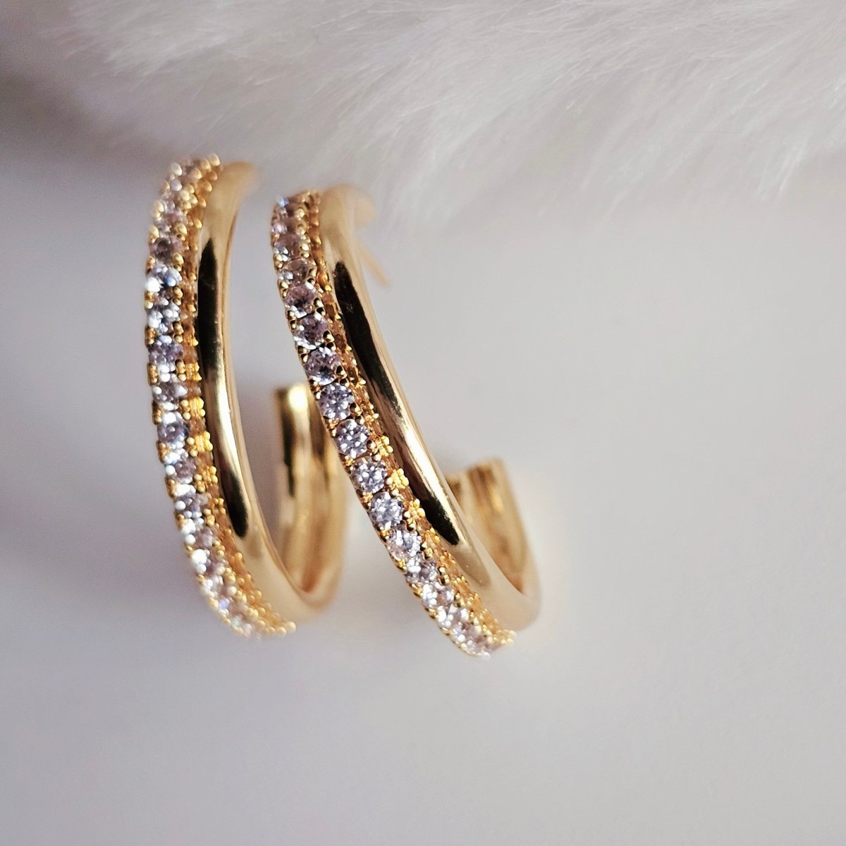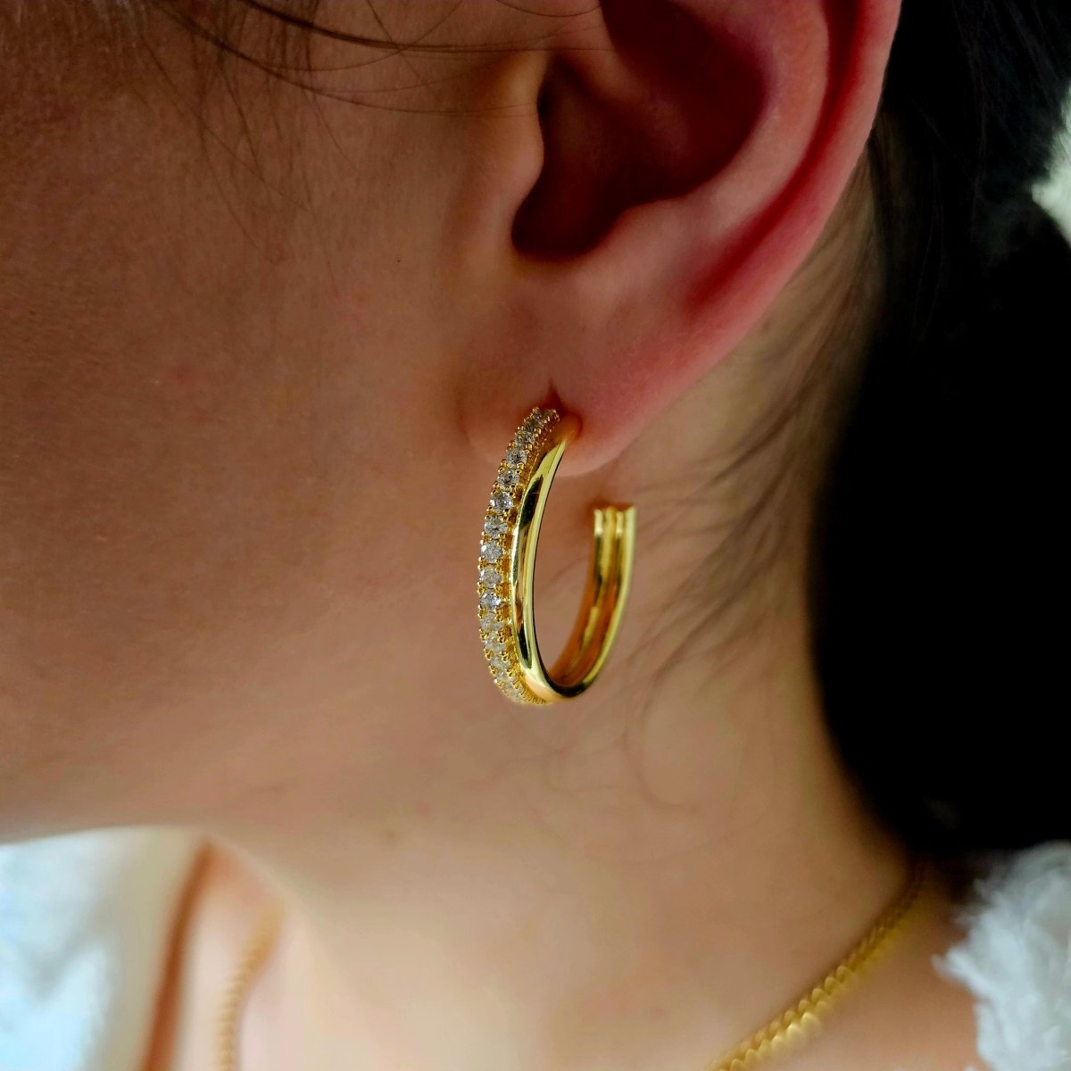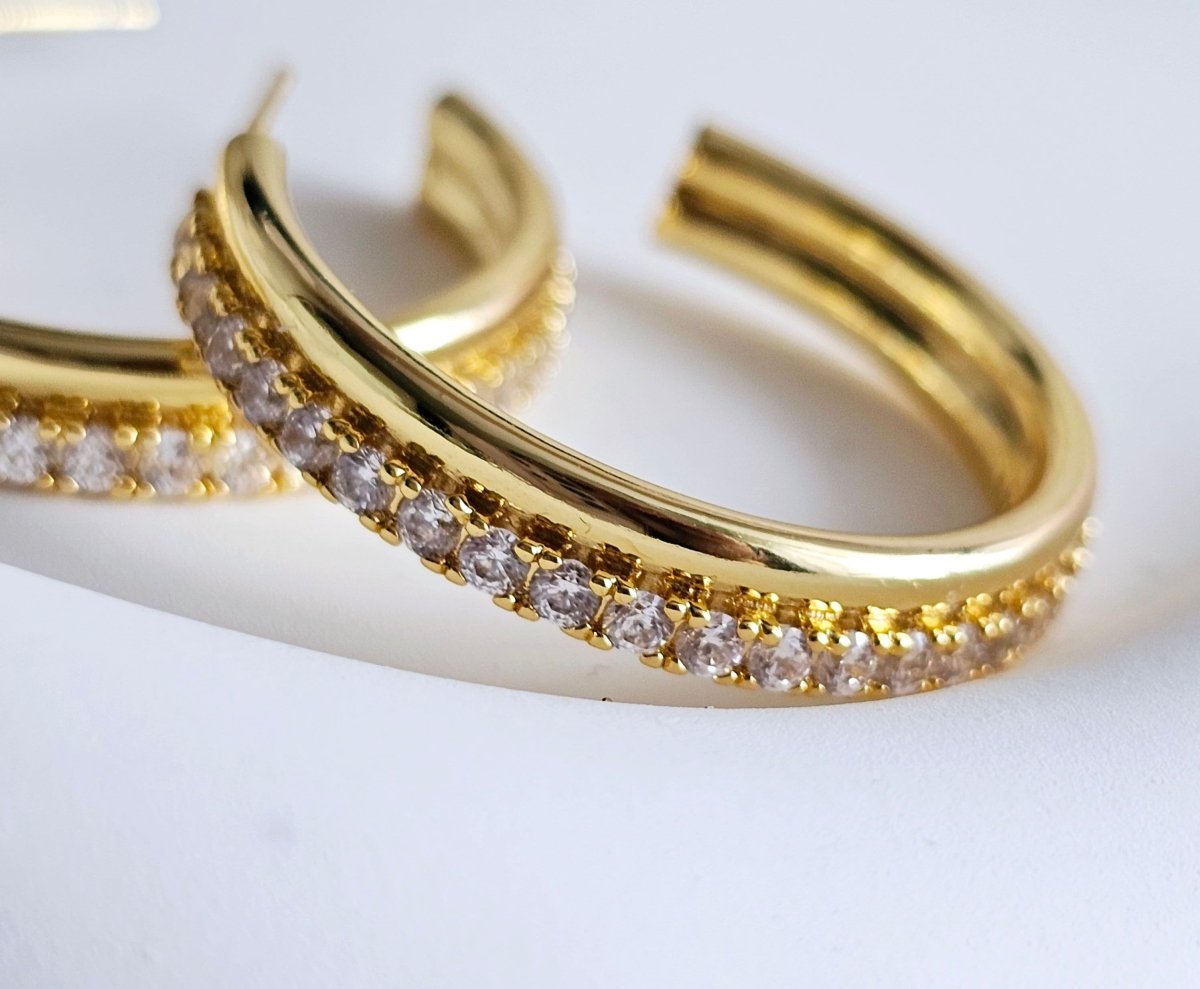 The perfect C hoops with a bit of a sparkle! Our Multi Loop Hoops are perfect for building up your jewellery looks. One layer is a thin gold smooth curve while the other layer has been embellished with subtle cubic zirconia stones to add some textured sparkle. Timeless, chic and just waiting to be added to your collection; wear the clear crystal studded hoops on their own to lift an evening outfit with this charming pair.