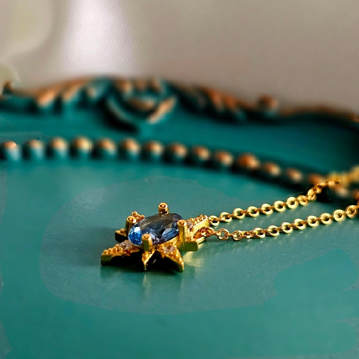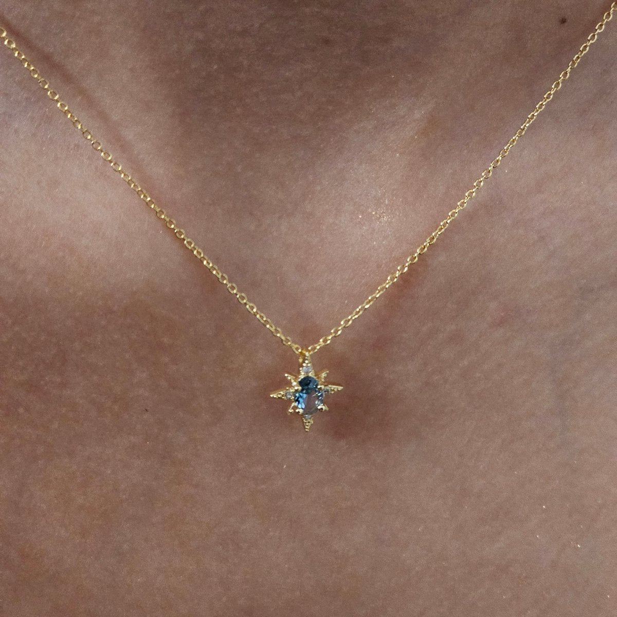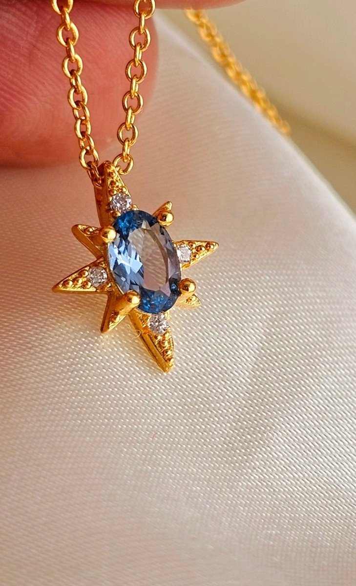 Beautiful and charming, this translucent cornflower Blue Sapphire is accompanied by tiny cubic zirconia crystals on the northern star pendant.These gems clear sit studded in the centre and reflect the light creating just the right amount of sparkle!