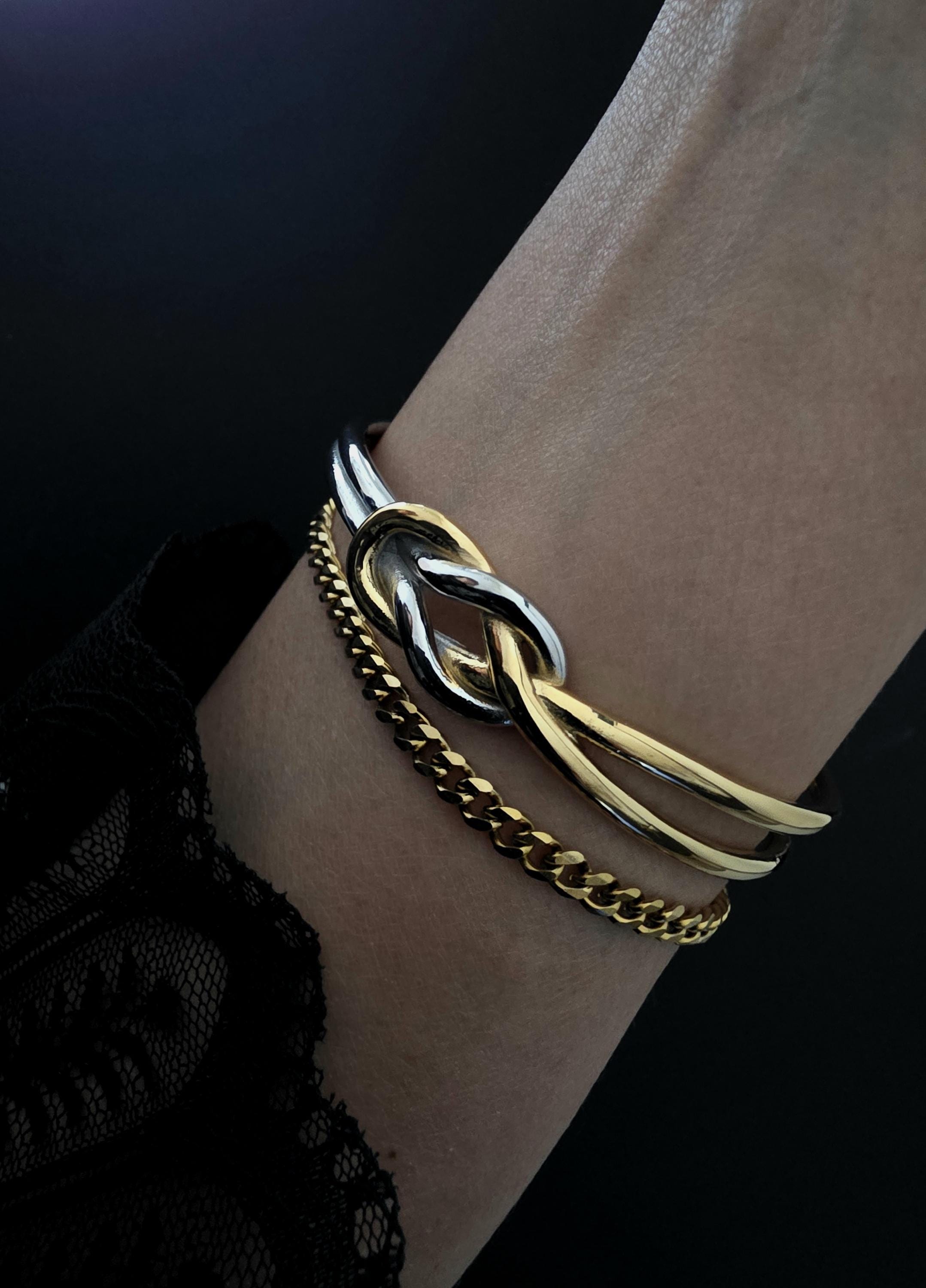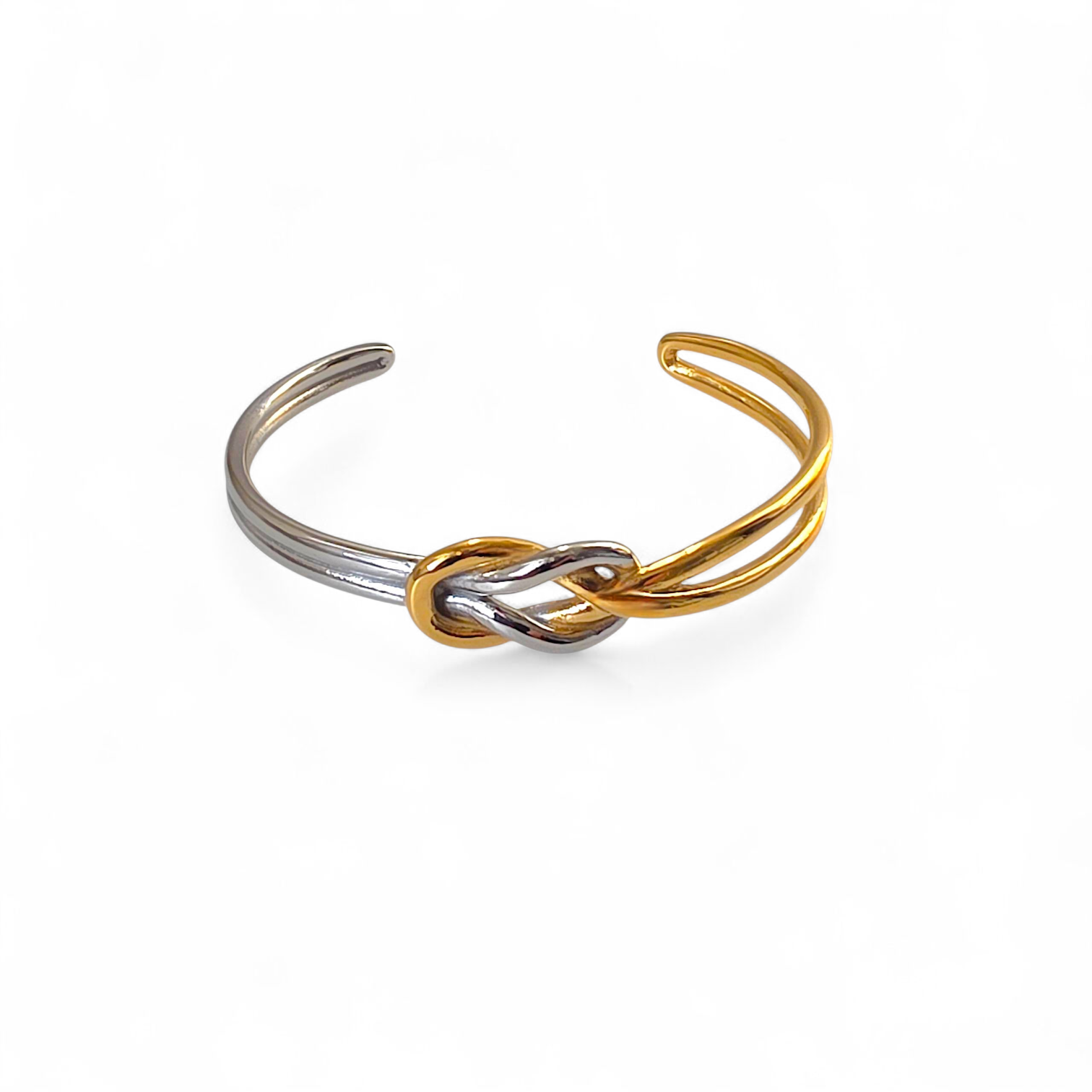 Simple and beautiful knotted Two-tone cuff bangle-bracelet. This gorgeous silver piece is made with love, and is going to add that extra sparkle to your outfit; just slip this open-ended cuff onto your wrist and adjust with a gentle bend to your liking and get loaded with compliments.