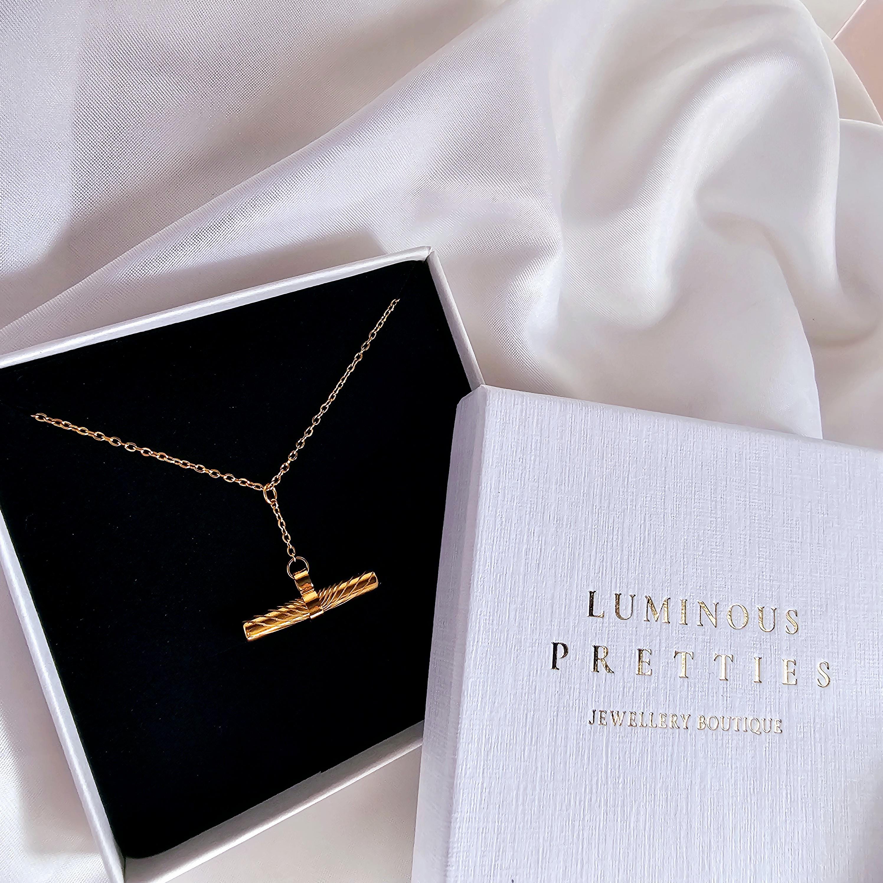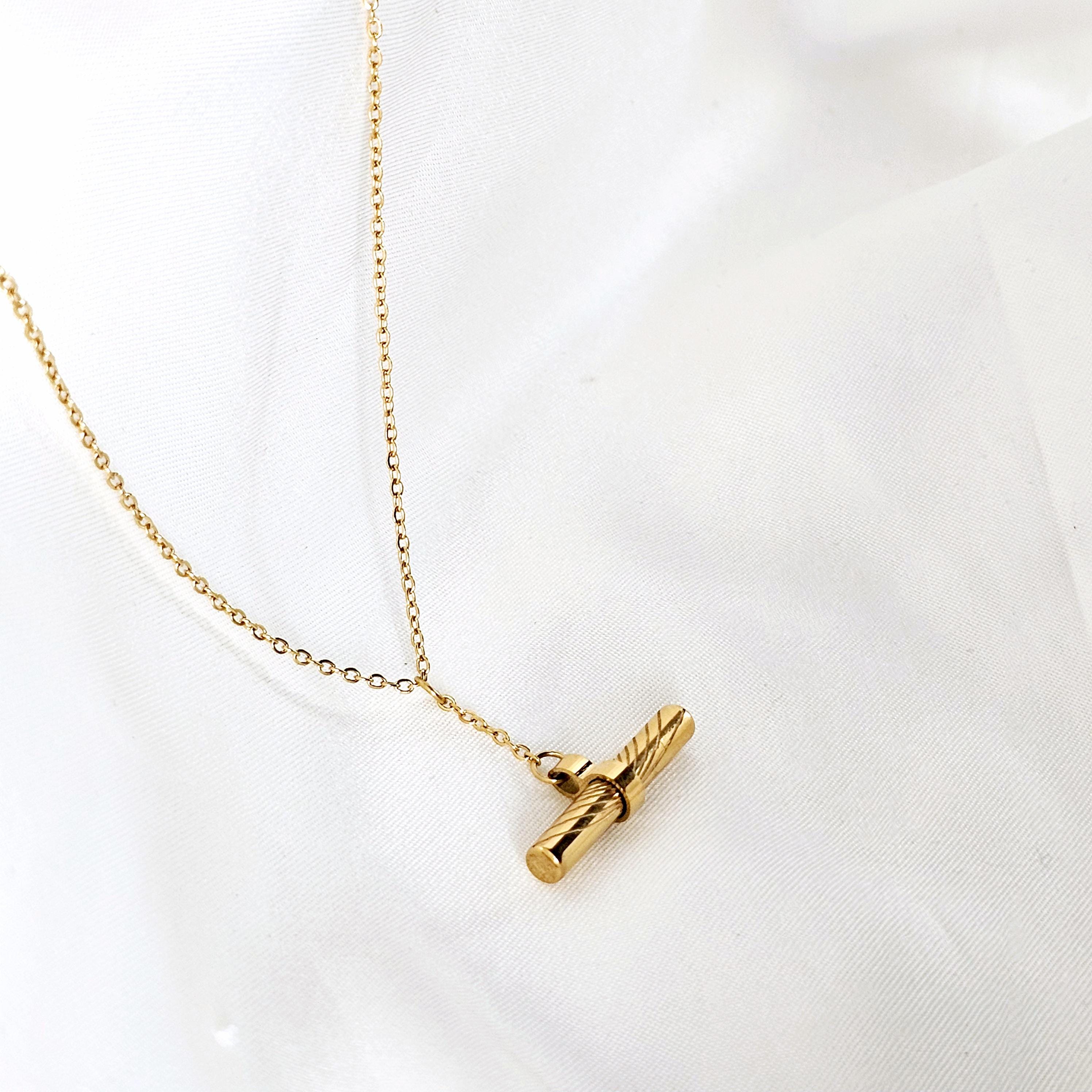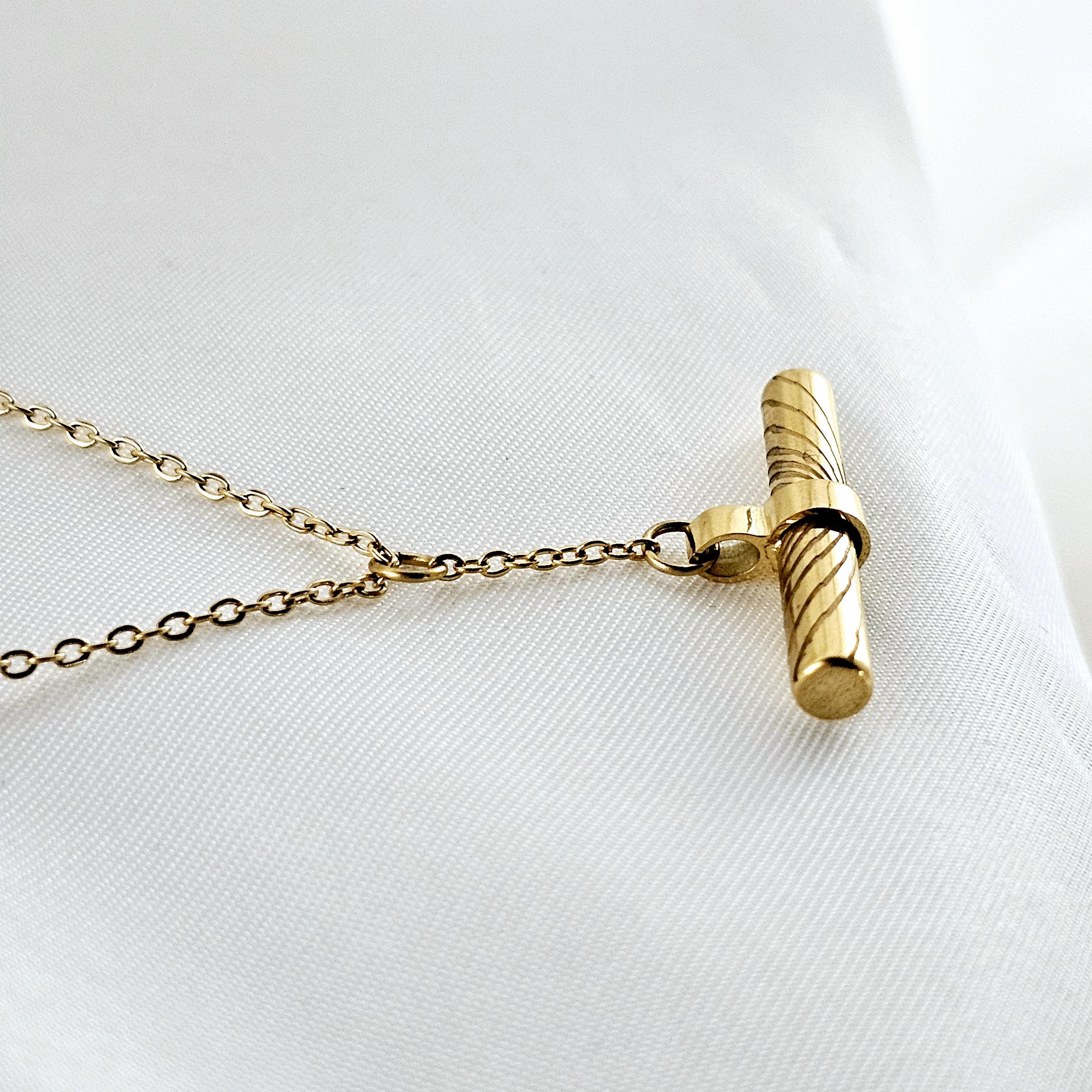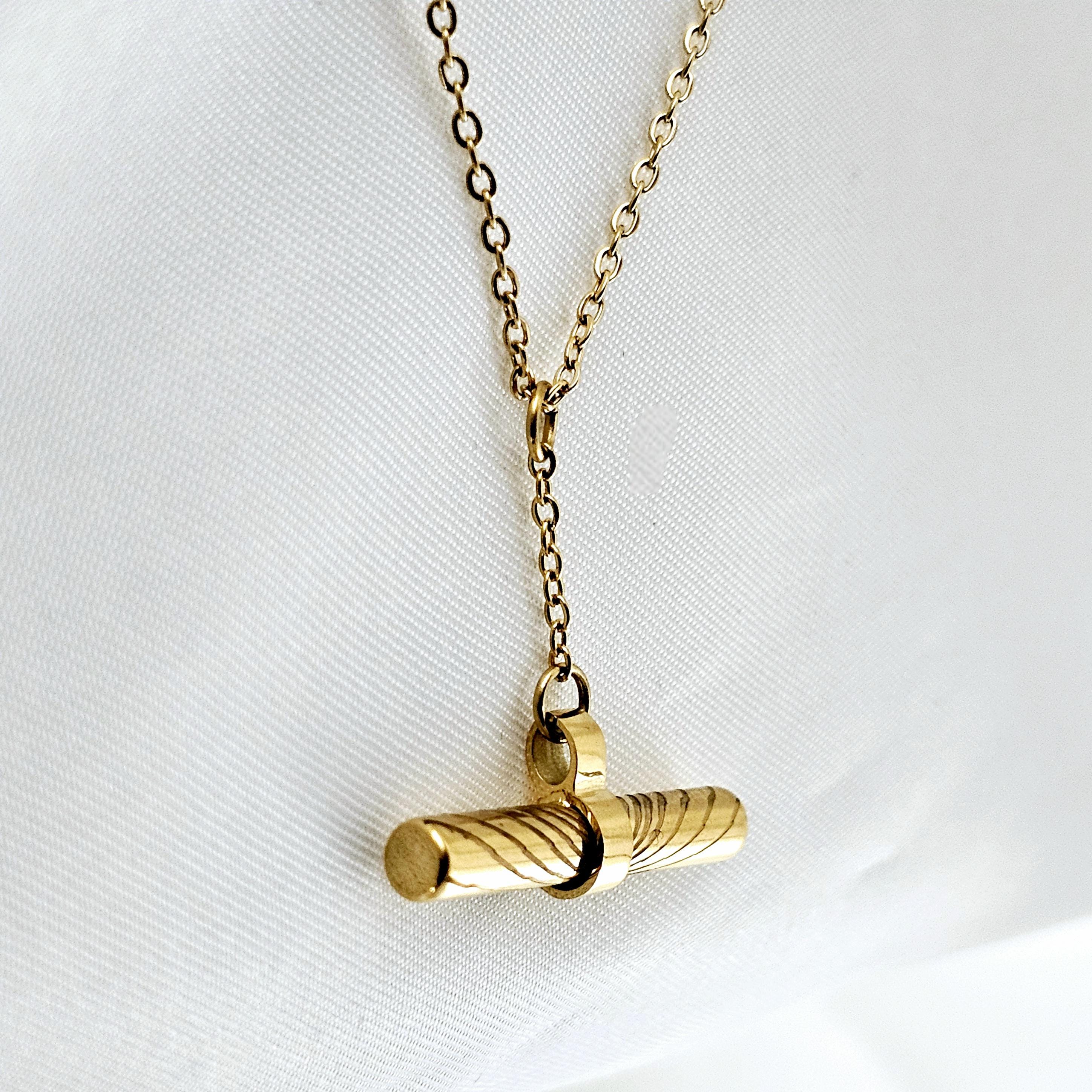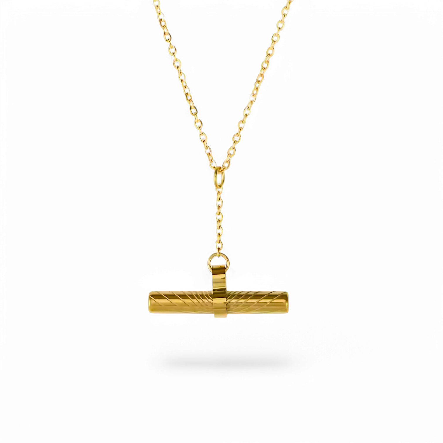 This necklace showcases a trending T-bar pendant crafted in 18k gold over titanium steel, offering both strength and style. The pendant’s delicate, patterned texture symbolizes balance, making it not only a beautiful accessory but also a meaningful one. The sleek, cylindrical design—also known as a balance bar—moves freely thanks to the small, linked connector, adding a touch of movement and elegance. Paired with a fine chain, this piece is perfect for anyone looking for an effortlessly chic, modern look that holds deeper significance.