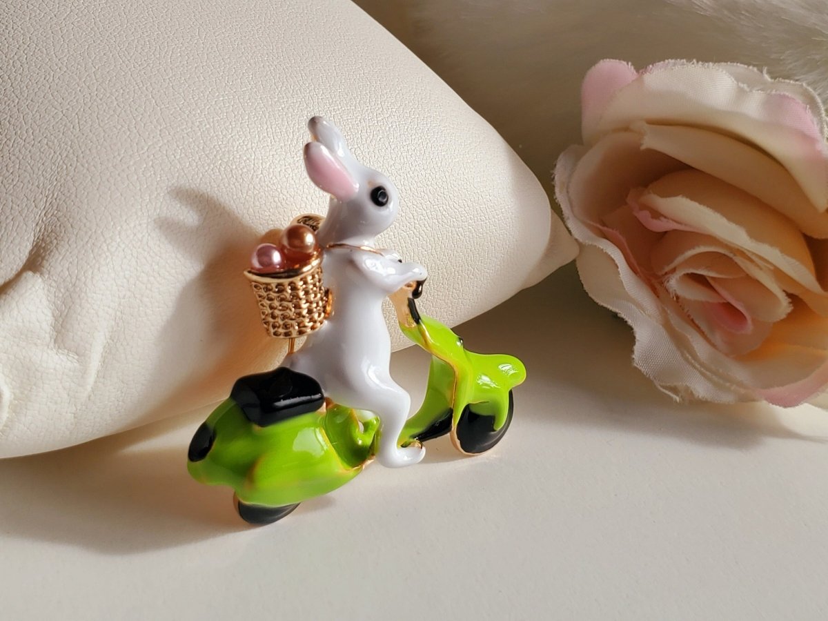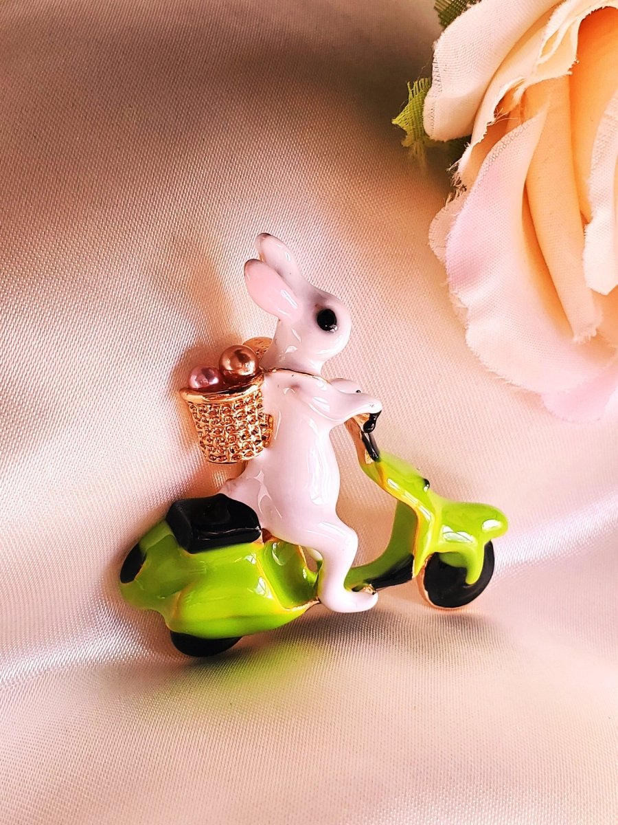 Add a touch of whimsy to your ensemble with this playful enamel brooch, featuring a bunny riding a vintage Vespa with a wicker basket full of lustrous coral-hued pearls. Crafted with premium cloisonné work, this piece showcases rich colors and exquisite detailing, making it a charming and unique accessory.