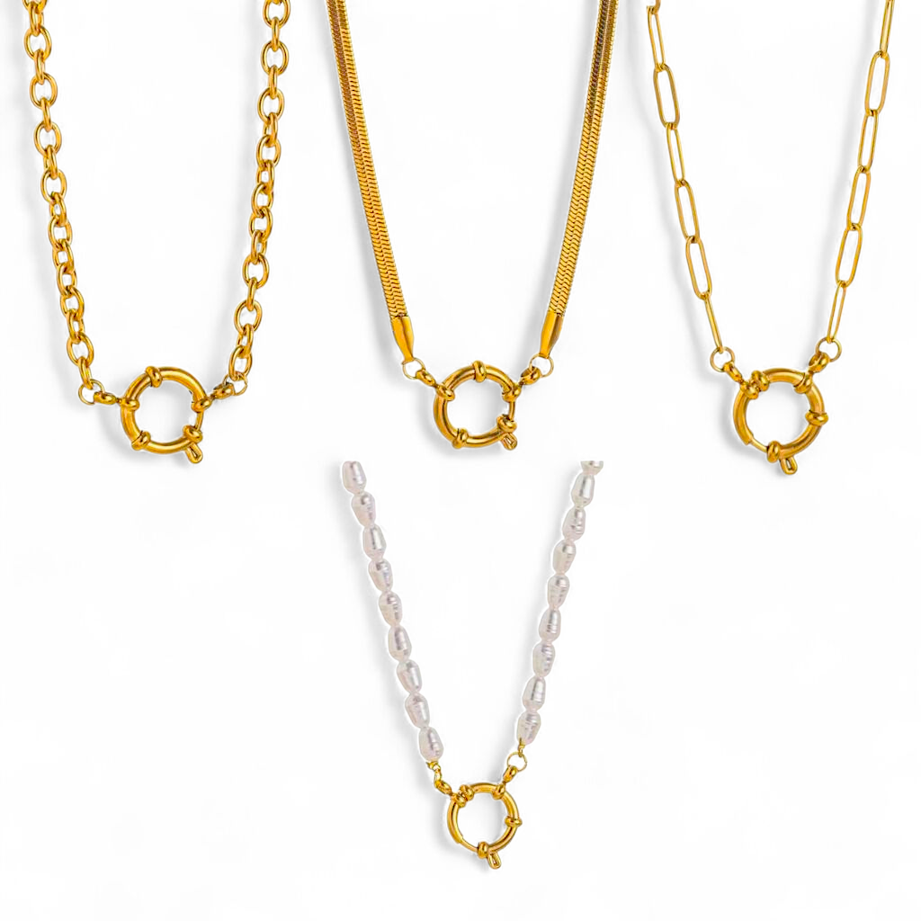 Elevate your look with our gold sailor clasp necklace – also known as a connector clasp or charm holder necklace. Designed for effortless layering and personalisation, this front clasp necklace lets you add your favourite charms or wear it solo. Available in 4 trending chain styles, it’s 18k gold PVD plated on stainless steel, hypoallergenic, tarnish-free, and waterproof for everyday wear.