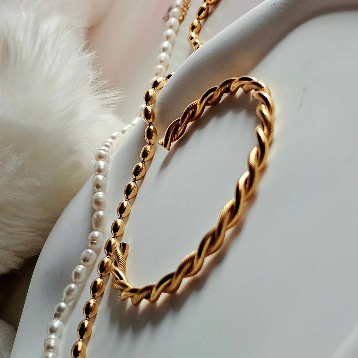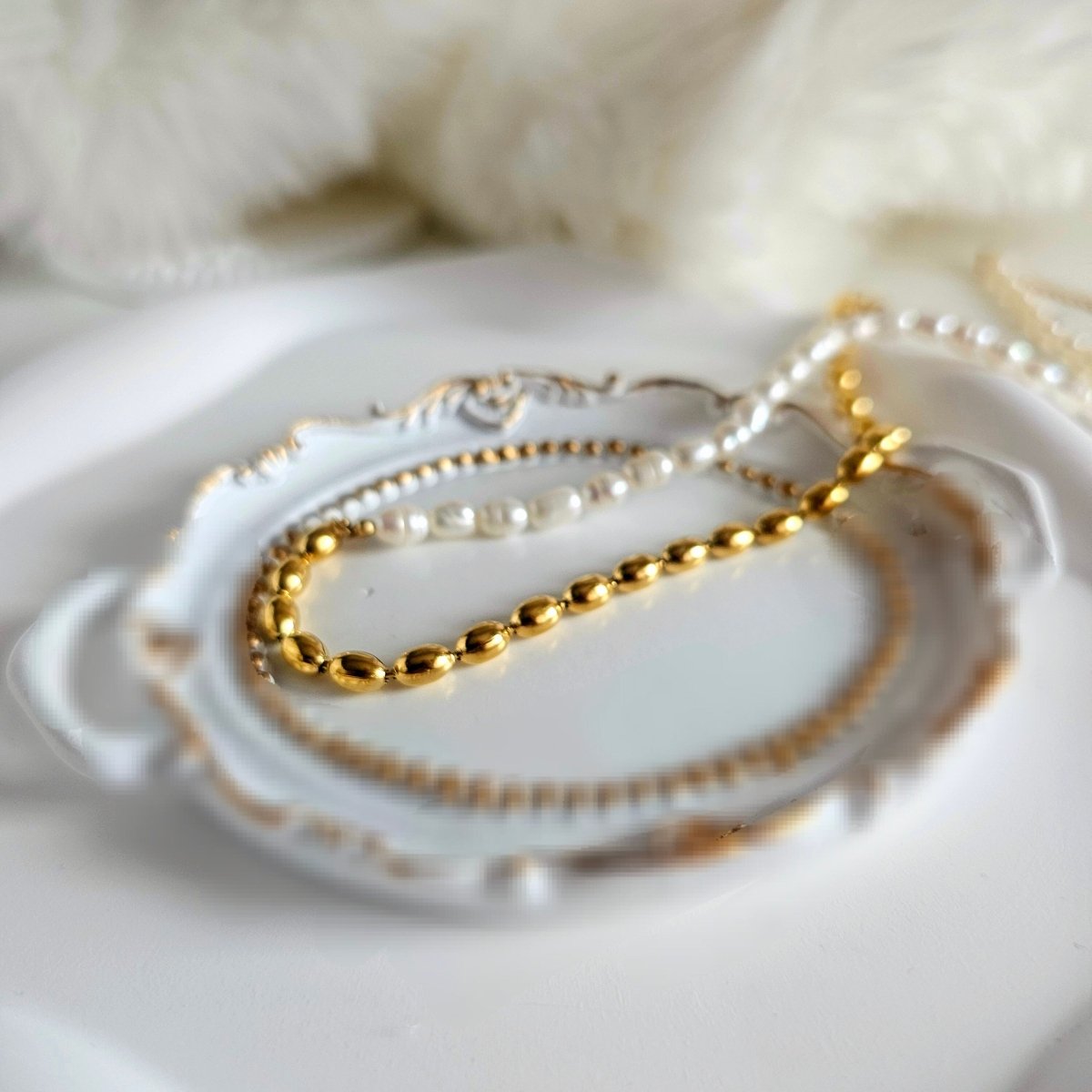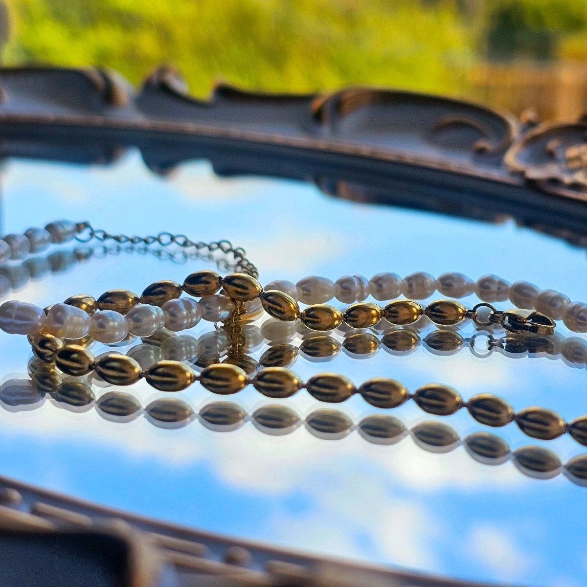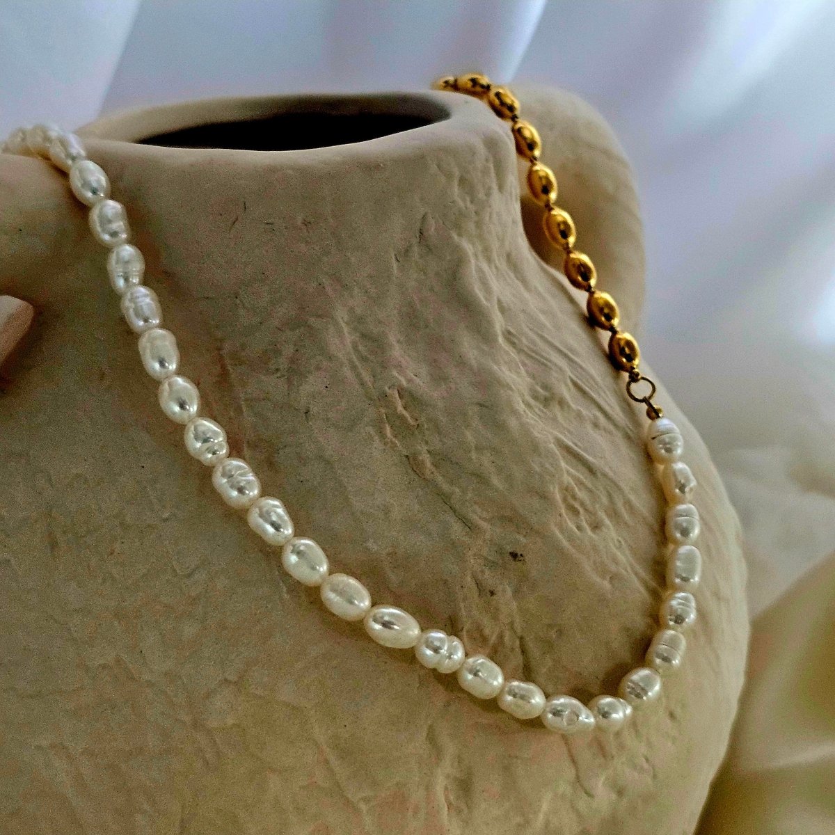 Elevate your style with this exquisite half-and-half necklace, featuring tarnish-free 18K gold and lustrous pearls. This versatile piece is a true gem in any jewellery collection. The design seamlessly blends classic elegance with modern chic, boasting gold rice beads on one side and radiant pearls on the other.