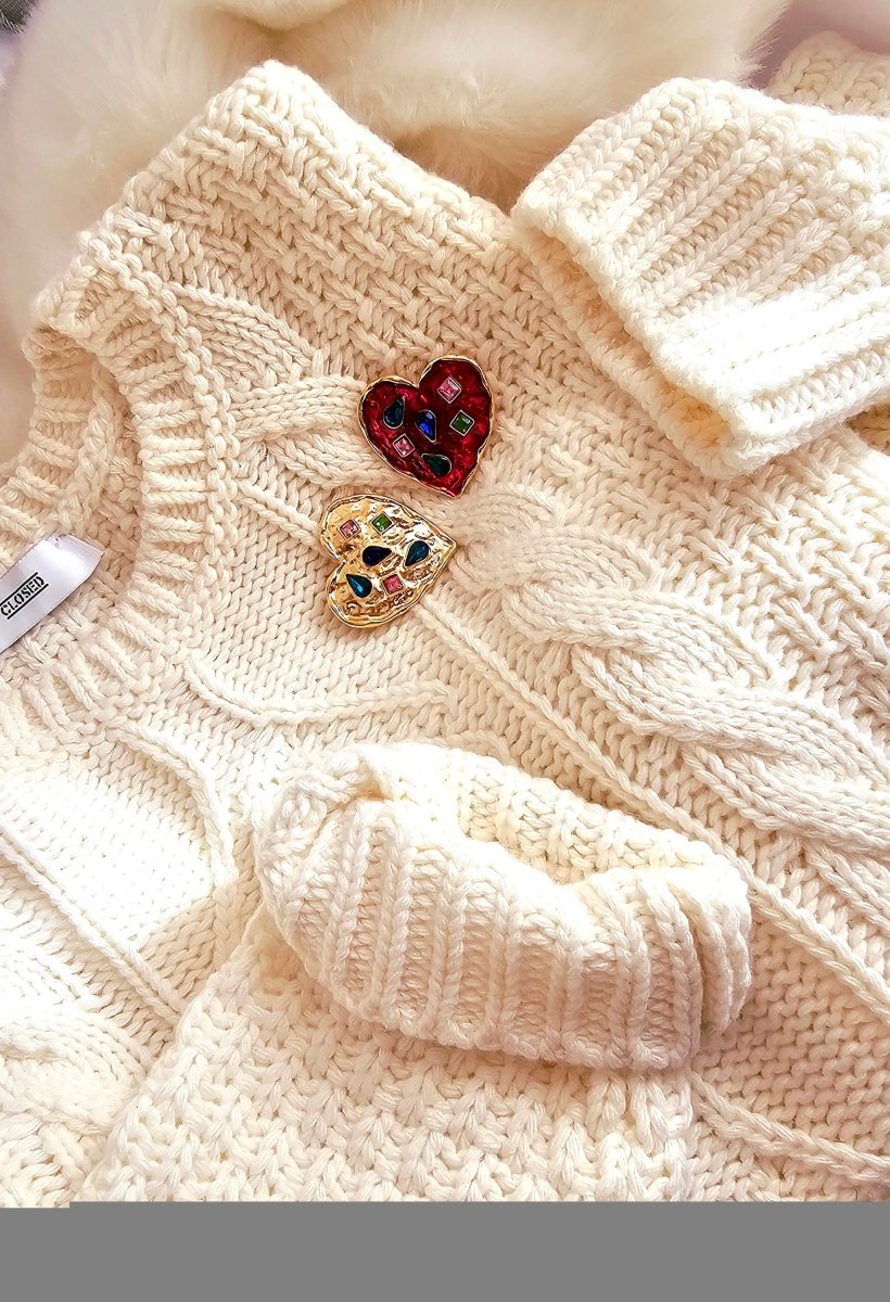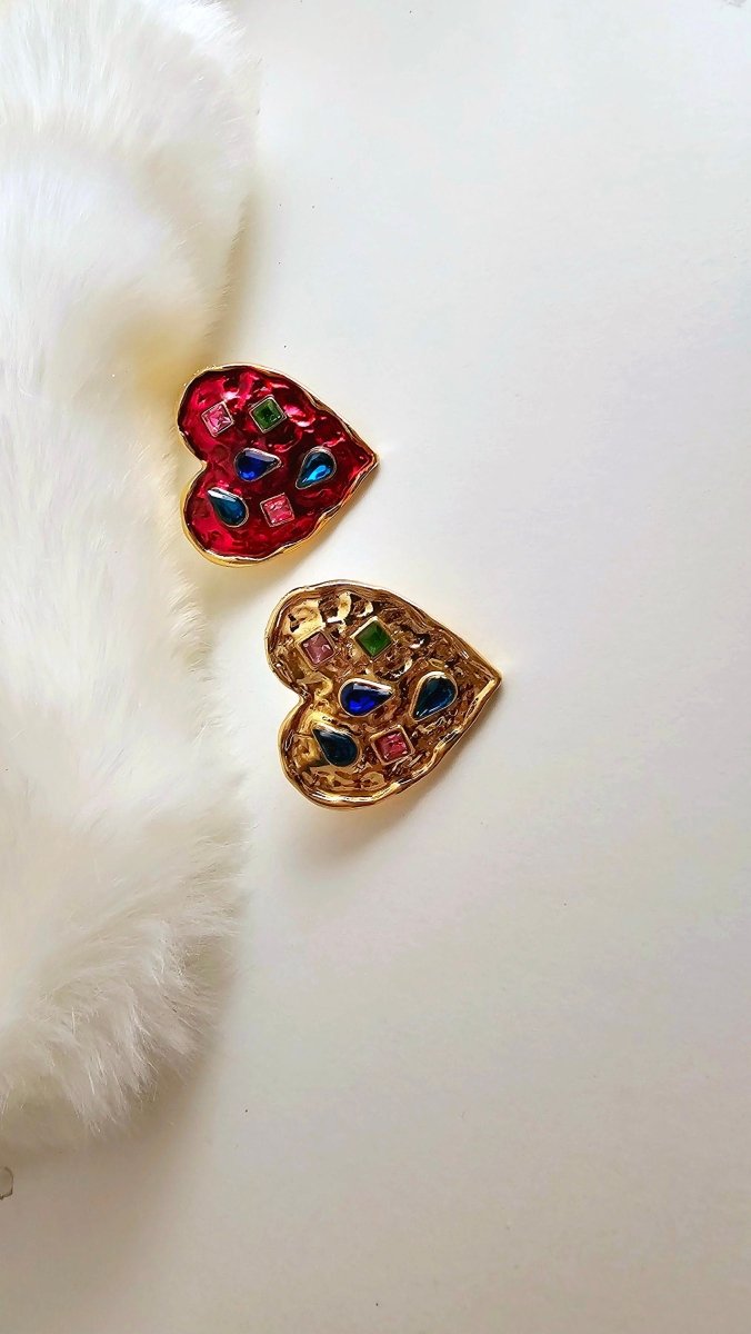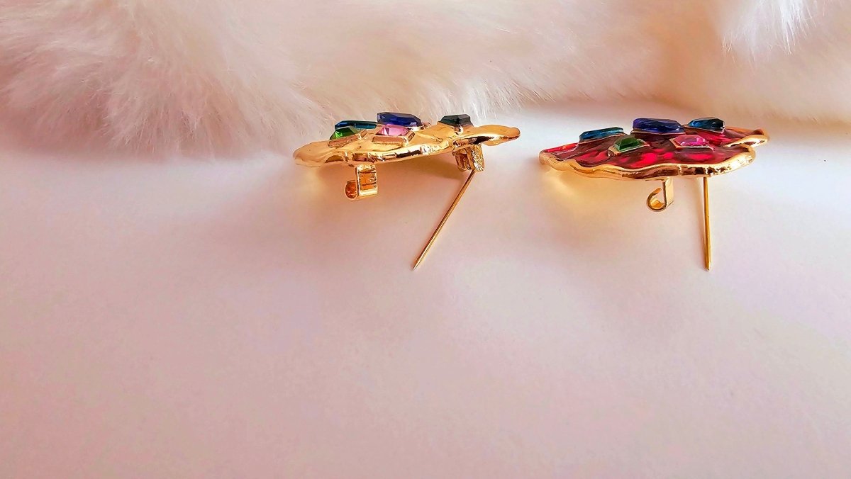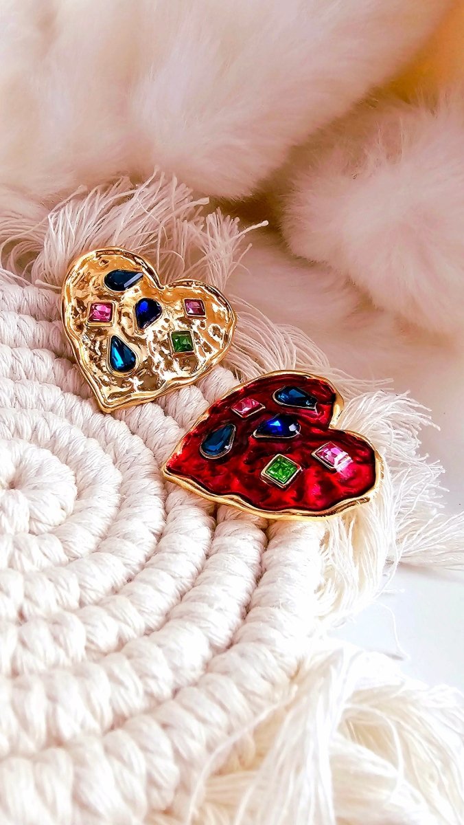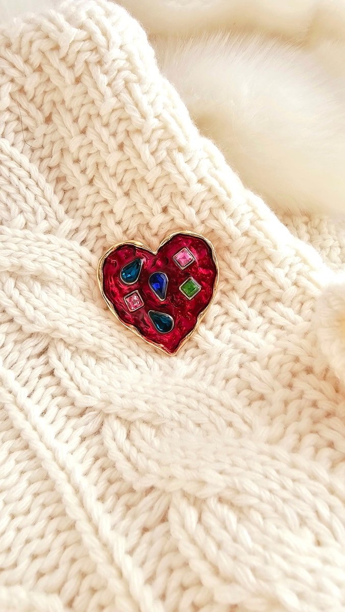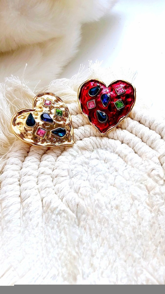 Fun, quirky and oh so charming! Thick Gold plated hearts with rich deep hues of Red and gorgeous little twinkling multicoloured cubic zirconia. The heart shaped unique Brooches are available in shining gold and deep red enamel.