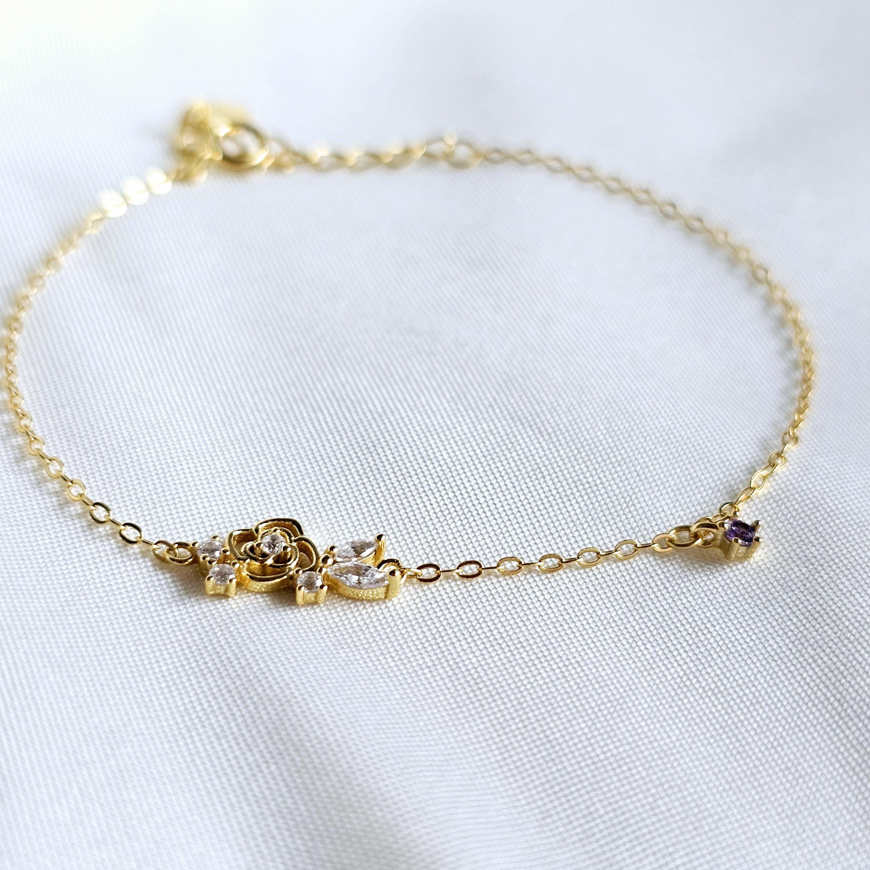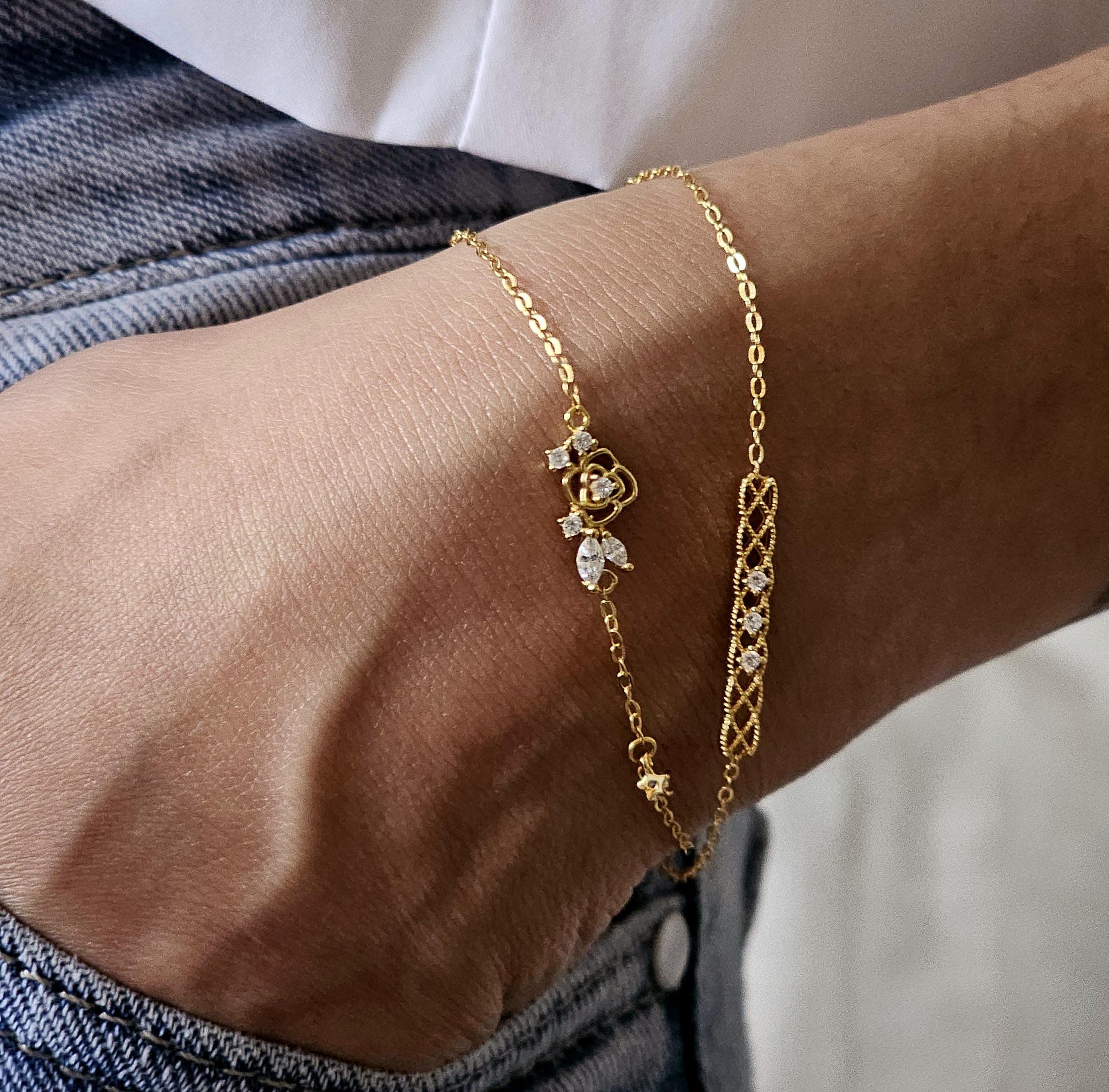 Introducing a stunning bracelet featuring 16k gold plating over sterling silver, adorned with premium quality cubic zirconia charms on a dainty intricate rose design. This adjustable chain bracelet is the perfect accessory for stacking or wearing solo, adding a touch of elegance to any outfit.