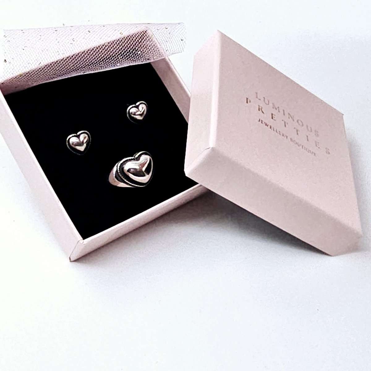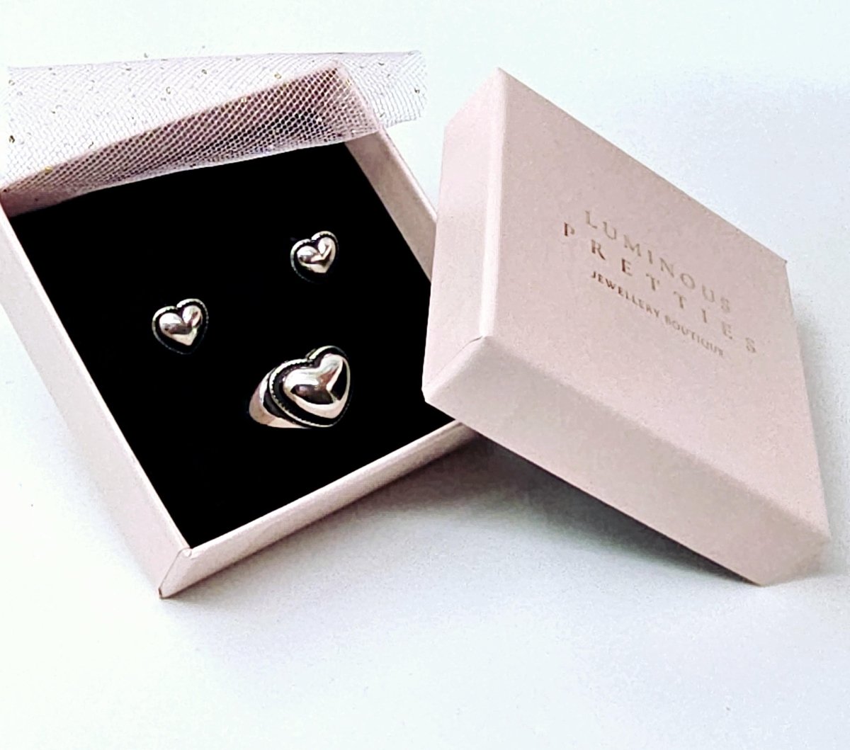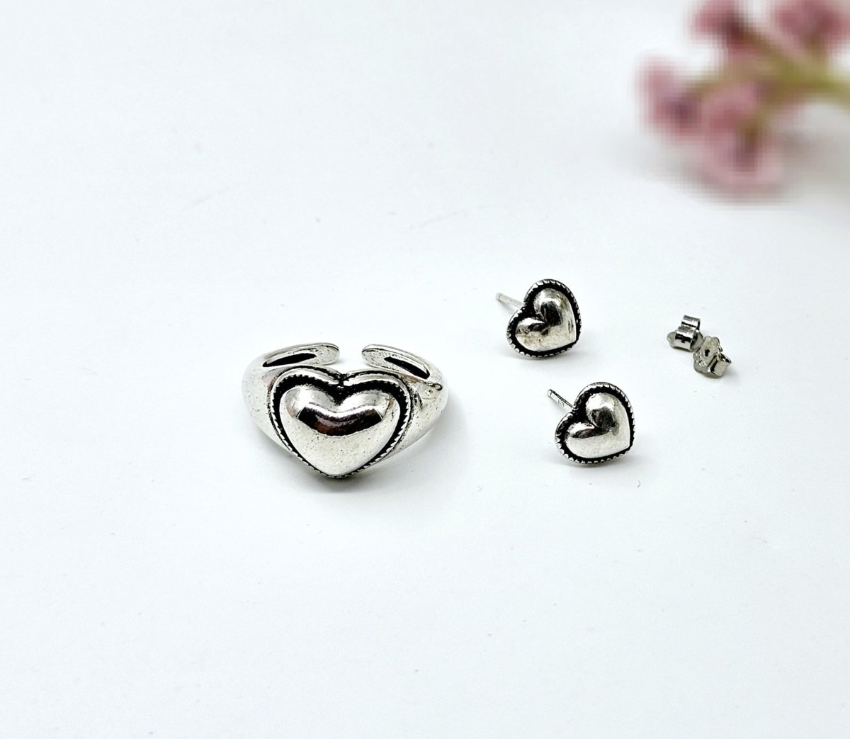 Discover this charming gift set, featuring a raised heart 3D design for a perfect blend of elegance and simplicity. The set includes an adjustable ring and matching stud earrings, both plated in sterling silver for a refined yet casual finish. The heart motif stands out with its bold and raised design, making each piece a statement of love and affection. Whether you're treating yourself or a loved one, this versatile set is ideal for daily wear, adding a touch of warmth and charm to any outfit.