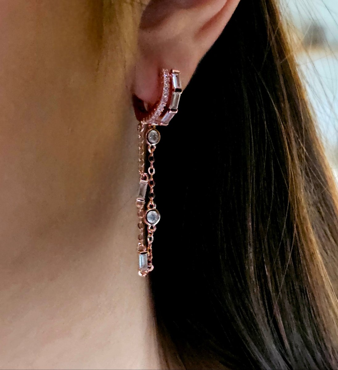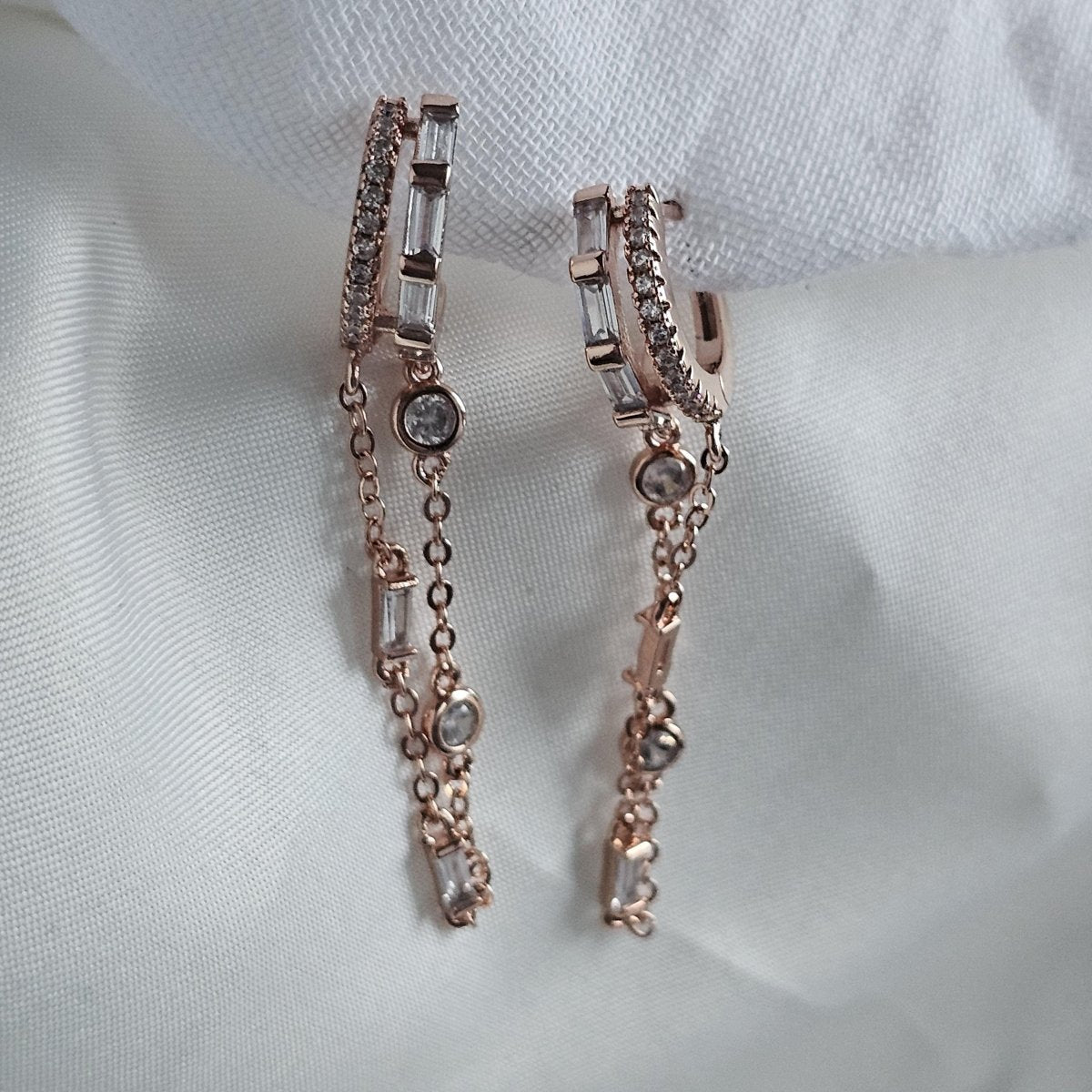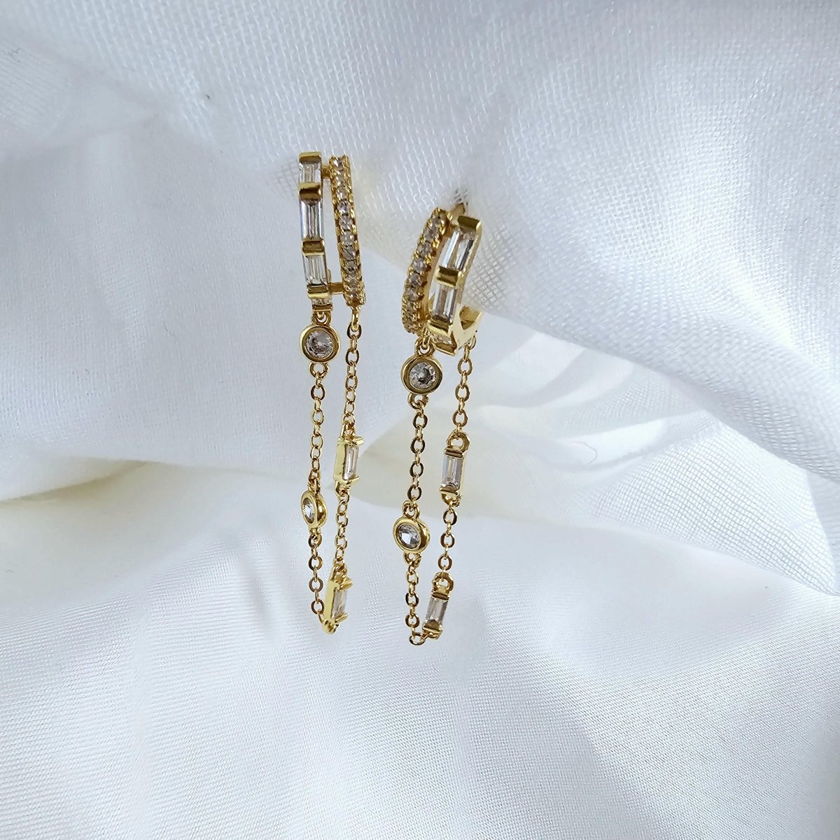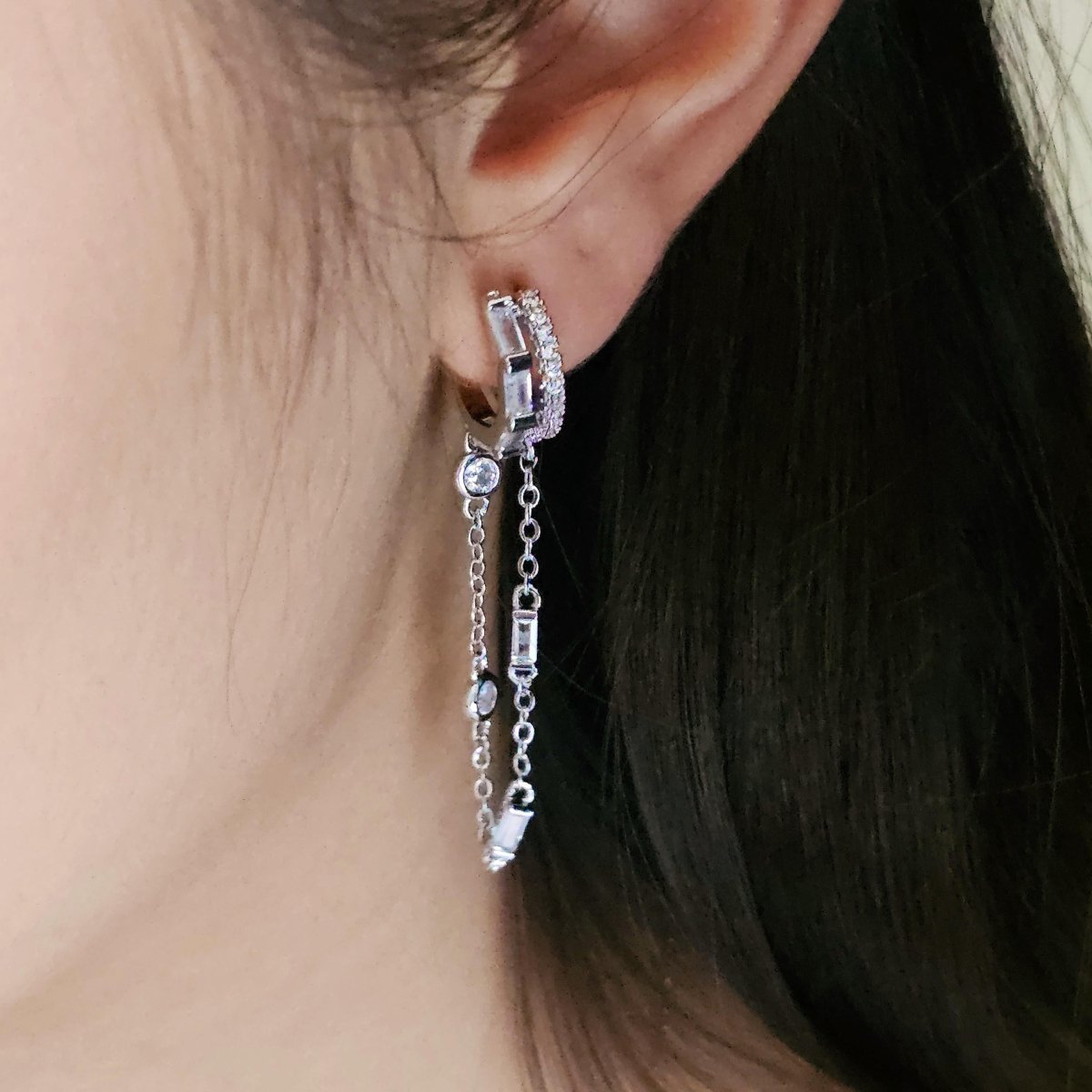 The ultimate stacking hack! Our Multi Loop Chain Dangle Hoops are perfect for building up your jewellery looks. Each earring features a structured double hoop design, giving the illusion of two piercings while only using one hoop. The hoops and chain dangles are adorned with premium cubic zirconia stones, adding a textured sparkle. Timeless, chic, and versatile — wear these crystal-studded hoops solo to lift an evening outfit or layer them for a statement look.