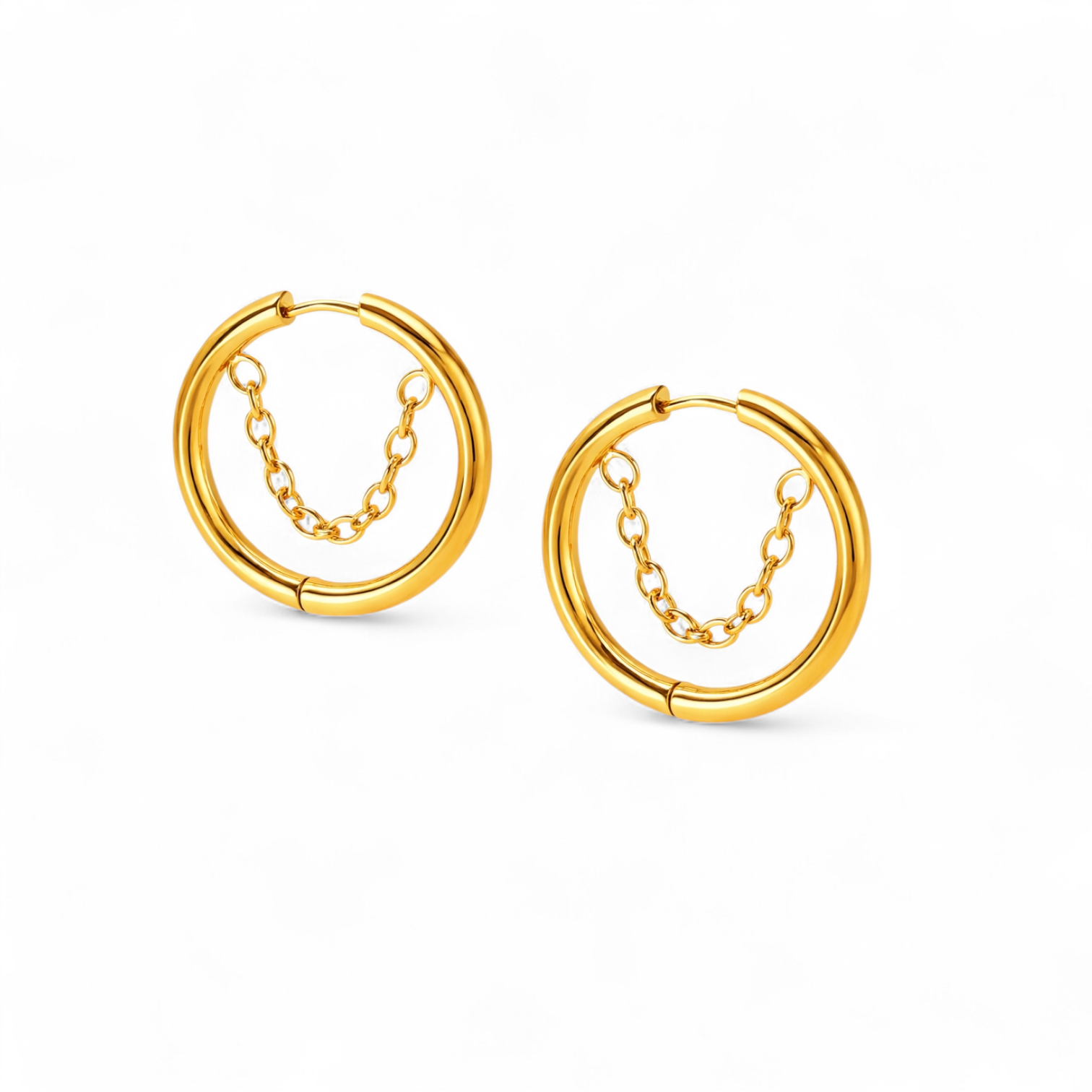 Chic 18K Gold Hoops, elegantly designed with a twist. Each hoop features an inner dangling chain, adding a dynamic and stylish flair. Crafted for longevity, these earrings are both tarnish-free and waterproof, ensuring they stay as stunning as the day you got them, no matter the weather. Perfect for elevating your daily wear or adding a sophisticated touch to your evening attire, these hoops blend elegance with a casual charm, making them a versatile addition to any jewelry collection.