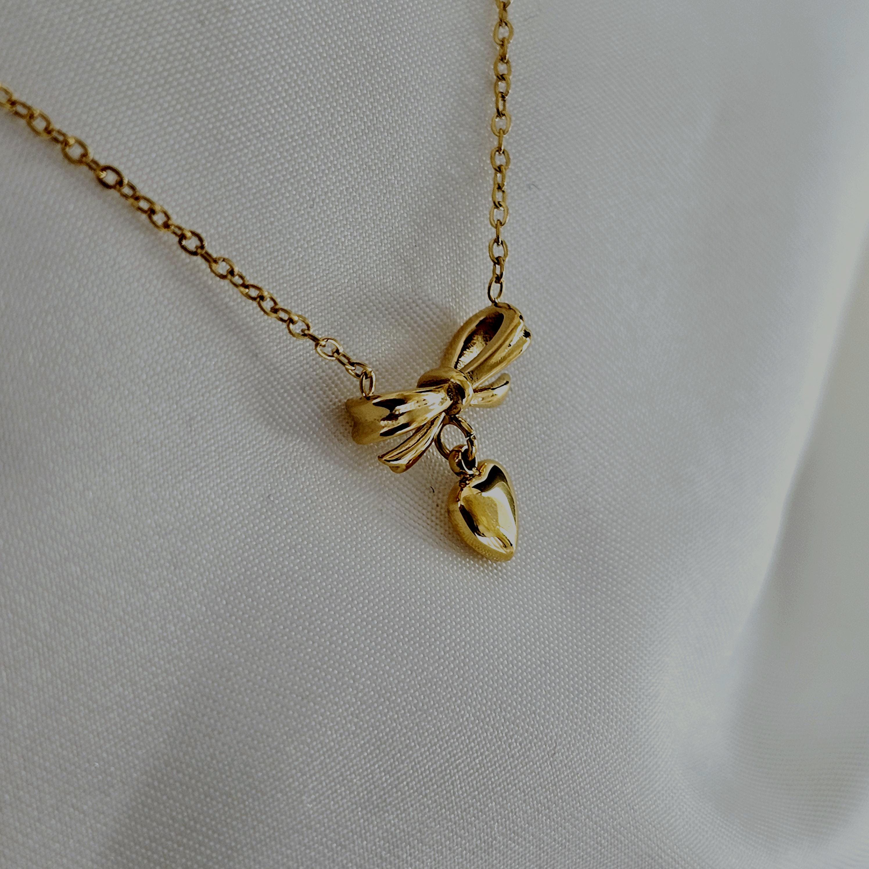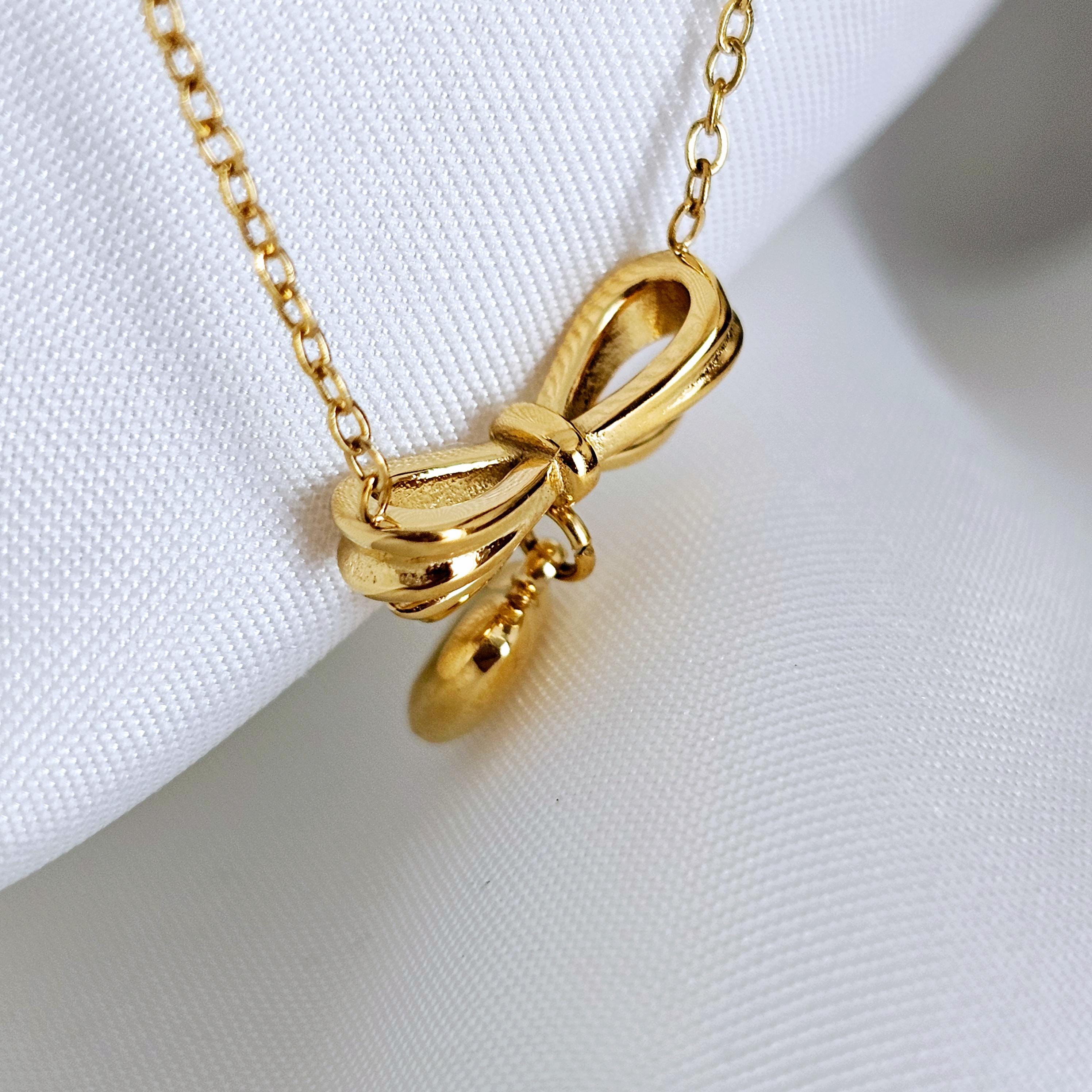 Add a touch of charm with this gold bow and heart necklace – featuring a 3D sculpted bow and a delicate heart drop charm. Sweet and stylish, this pendant necklace is perfect for everyday wear or dressing up a romantic look. The playful yet elegant design suits girls, teens, and women alike.