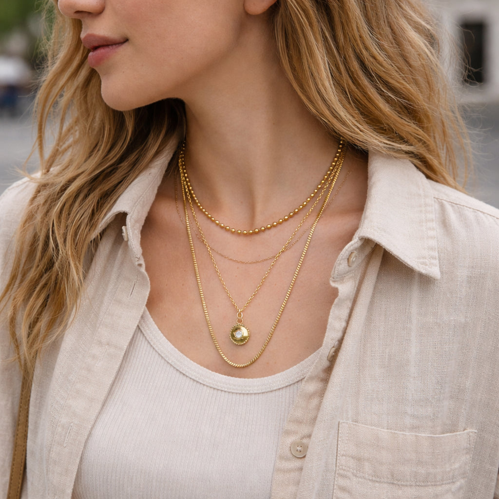 Crafted in 18K gold PVD-plated stainless steel, this necklace is made to be worn daily — shower-safe, sweat-safe, and tarnish-free.