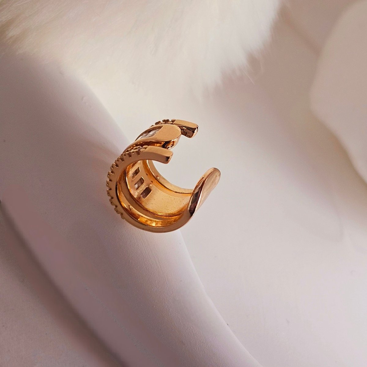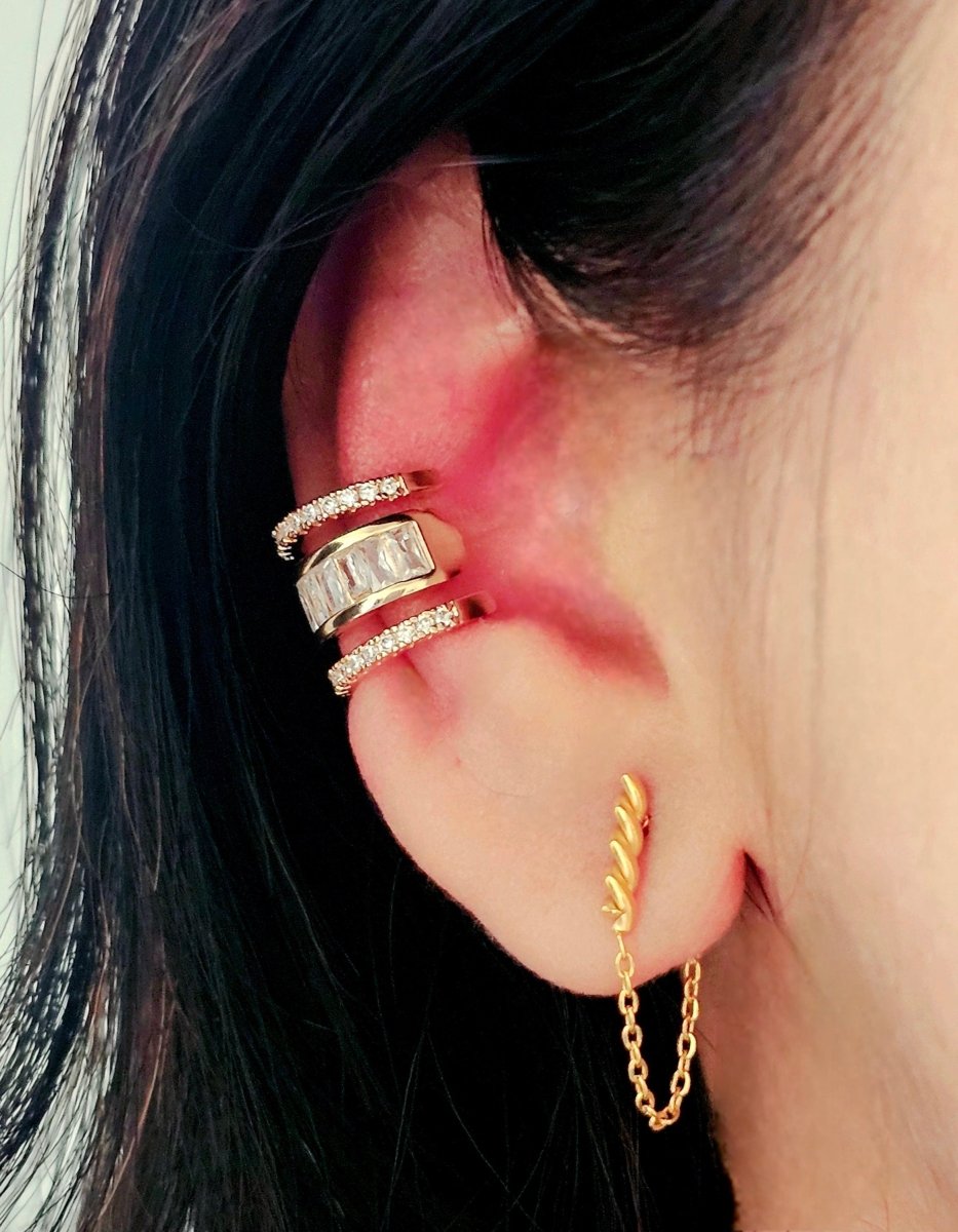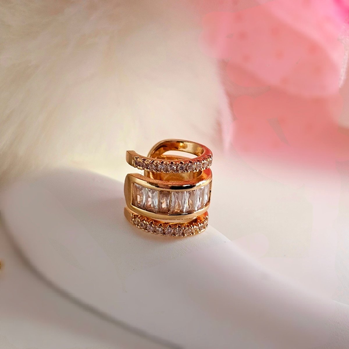 Triple Layered Faux ear cuffs 18k Gold plating. This chic design gives you a look of clustered gem and gold hoops in a single ear cuff giving the impression of a fuller pierced ear.