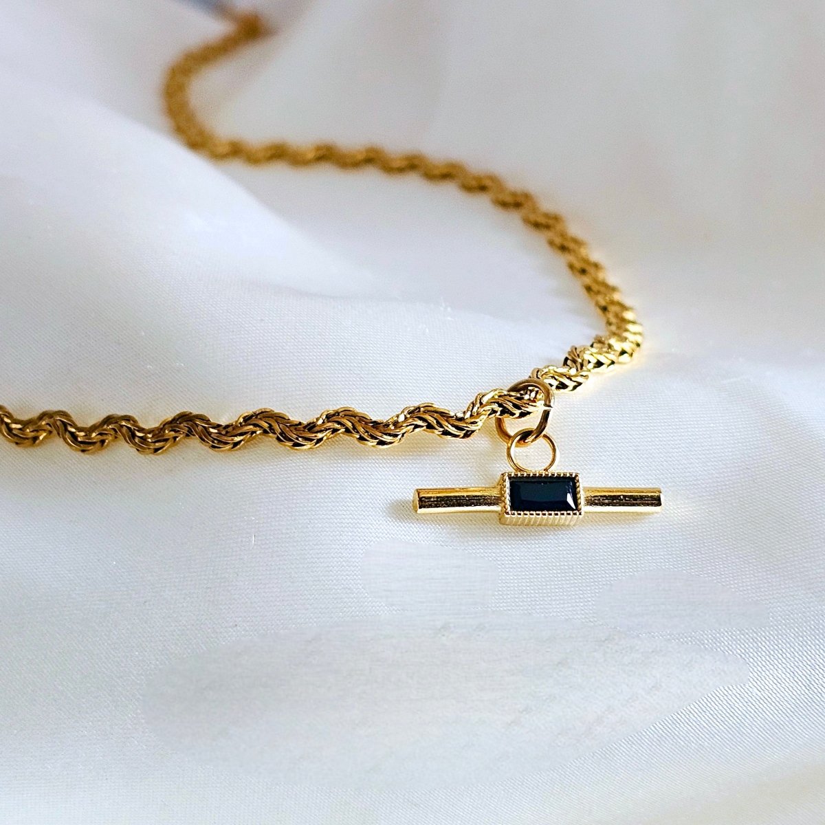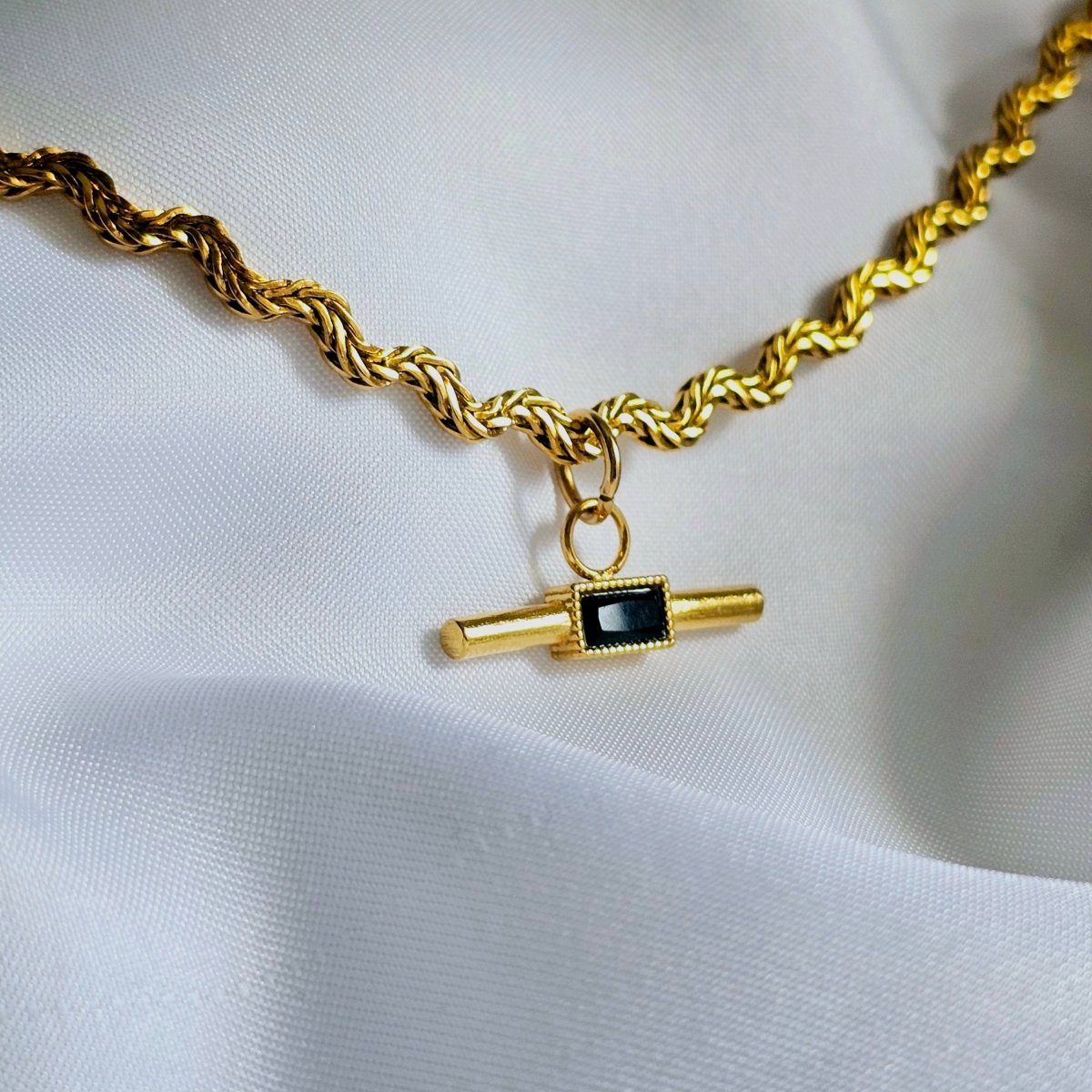 18k Gold on Titanium steel. DIMENSIONS: chain length 40cm + 5cm added extender chain.width of chain is 0.3mm. length of tbar is 2.3cm and the thickness is 0.5cm