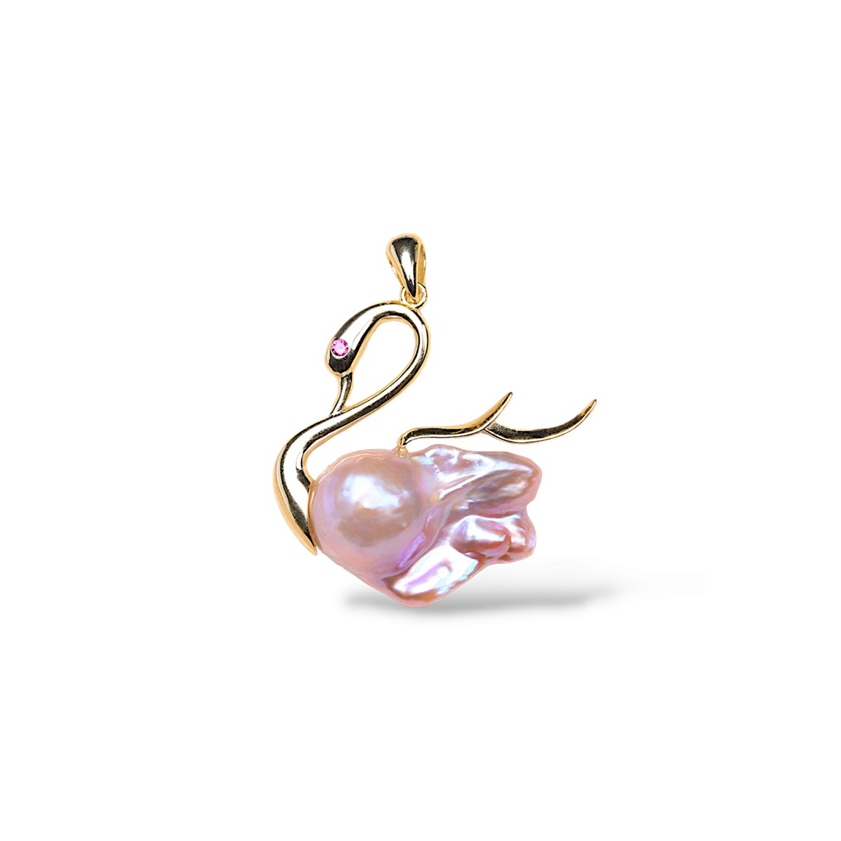 Adorn your neckline with this rare and exquisite baroque pearl pendant, where the irregular pink and ivory-hued pearl gracefully forms the shape of a Swan, adorned with a subtle ruby pink crystal.