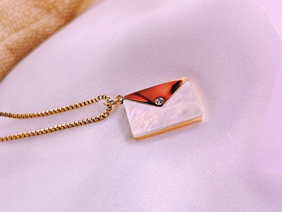 Take a look at this sleek 18K gold vermeil pendant necklace – it's a real showstopper. An envelope shaped gold filled pendant, inlaid with the smoothest mother of pearl, giving it that classy touch. And let's talk about the sparkle – the tiny clear diamond crystal catches the light just right. It's not just a piece of jewelry