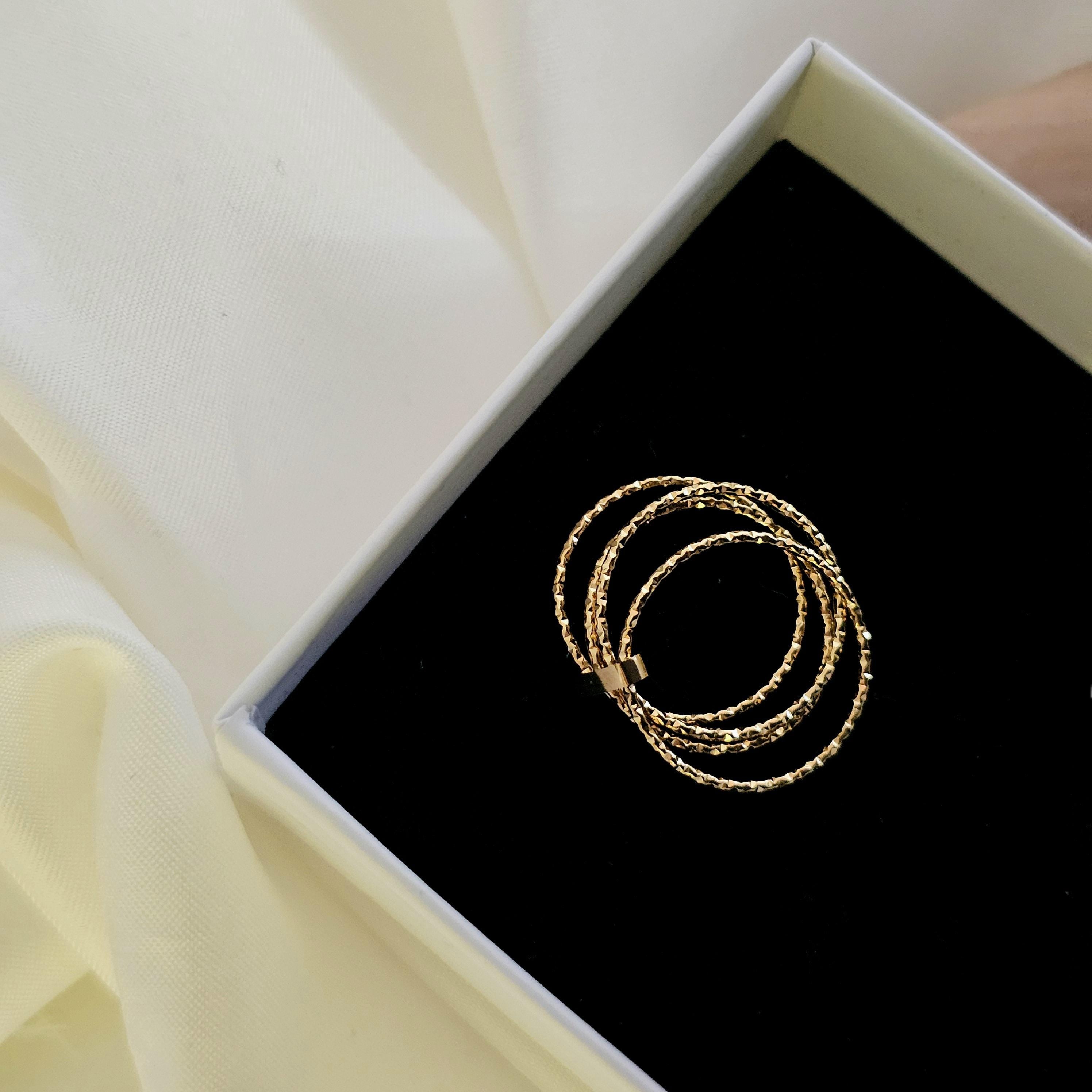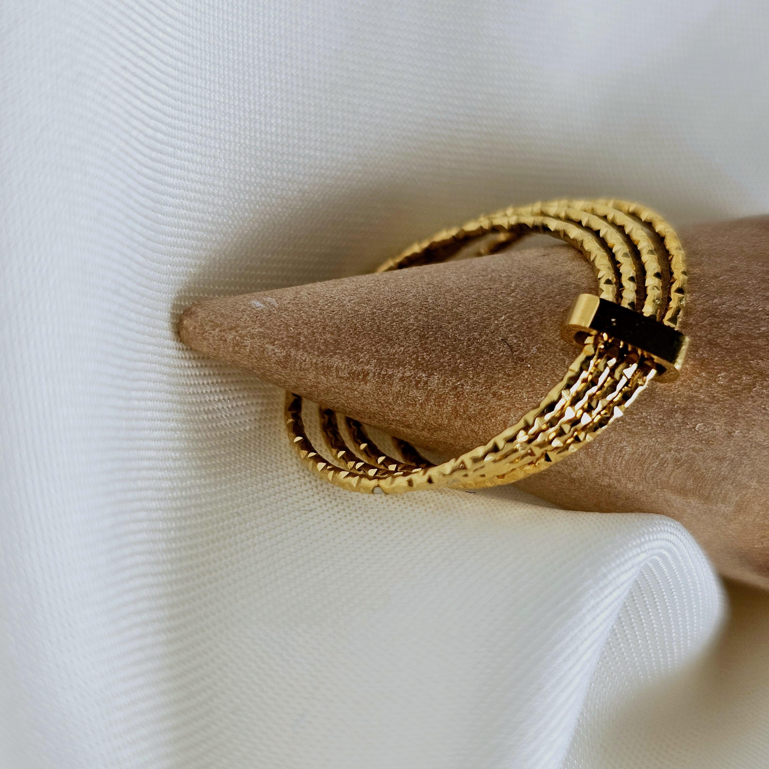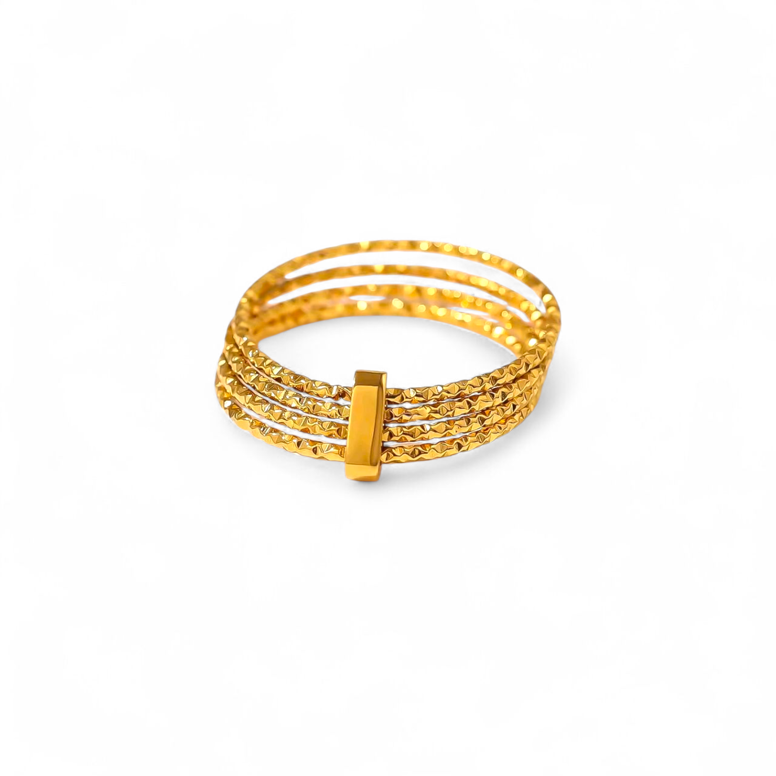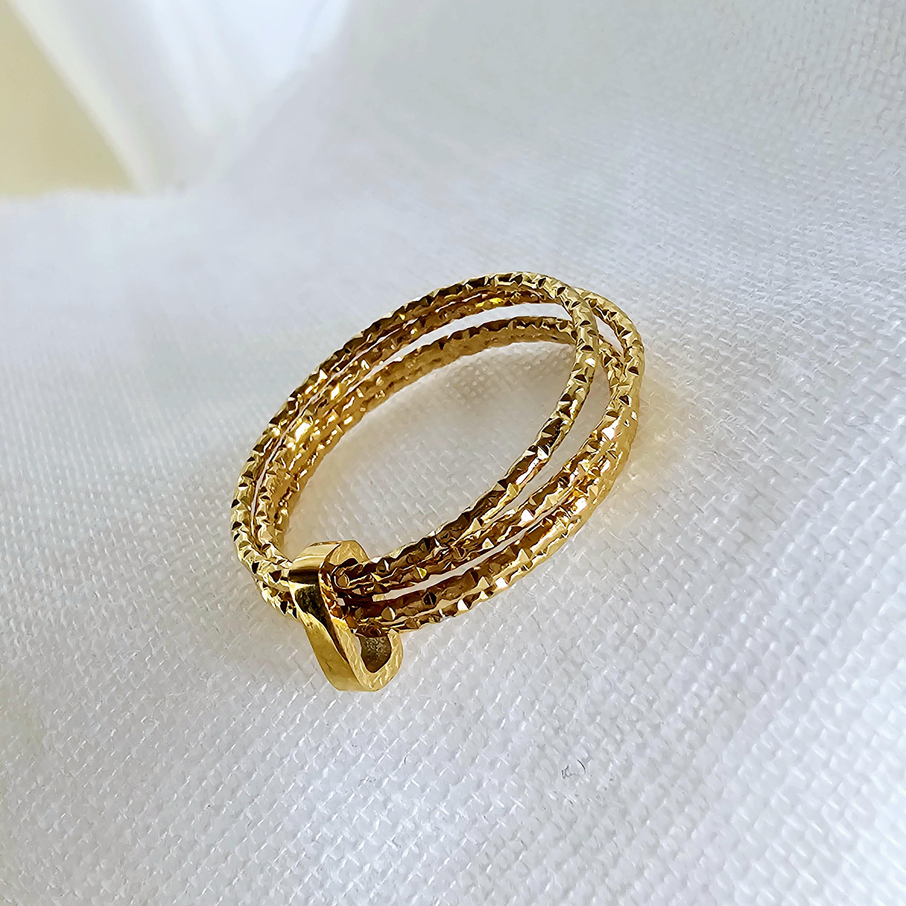Elevate your ring stack with this set of slim textured gold bands, linked together by a chic connector that keeps them stylishly grouped while still allowing subtle movement. Each band features a shiny faceted finish that catches the light beautifully, giving your hands an instant touch of elegance and sparkle.