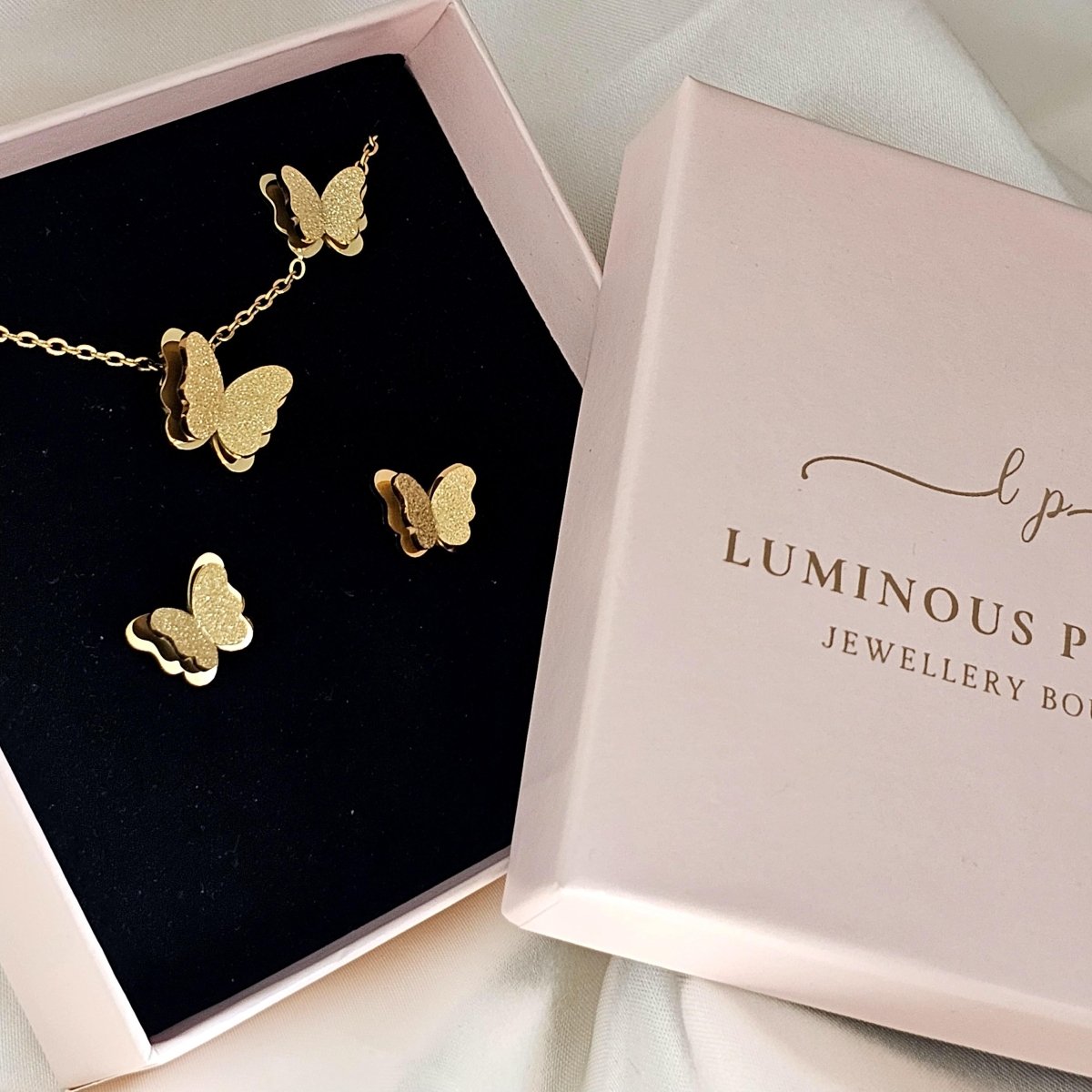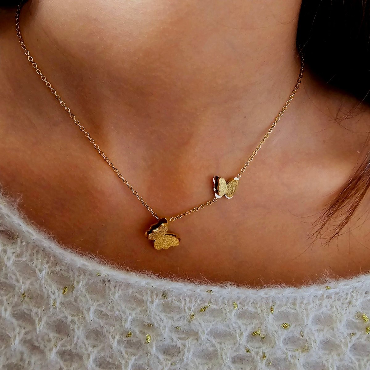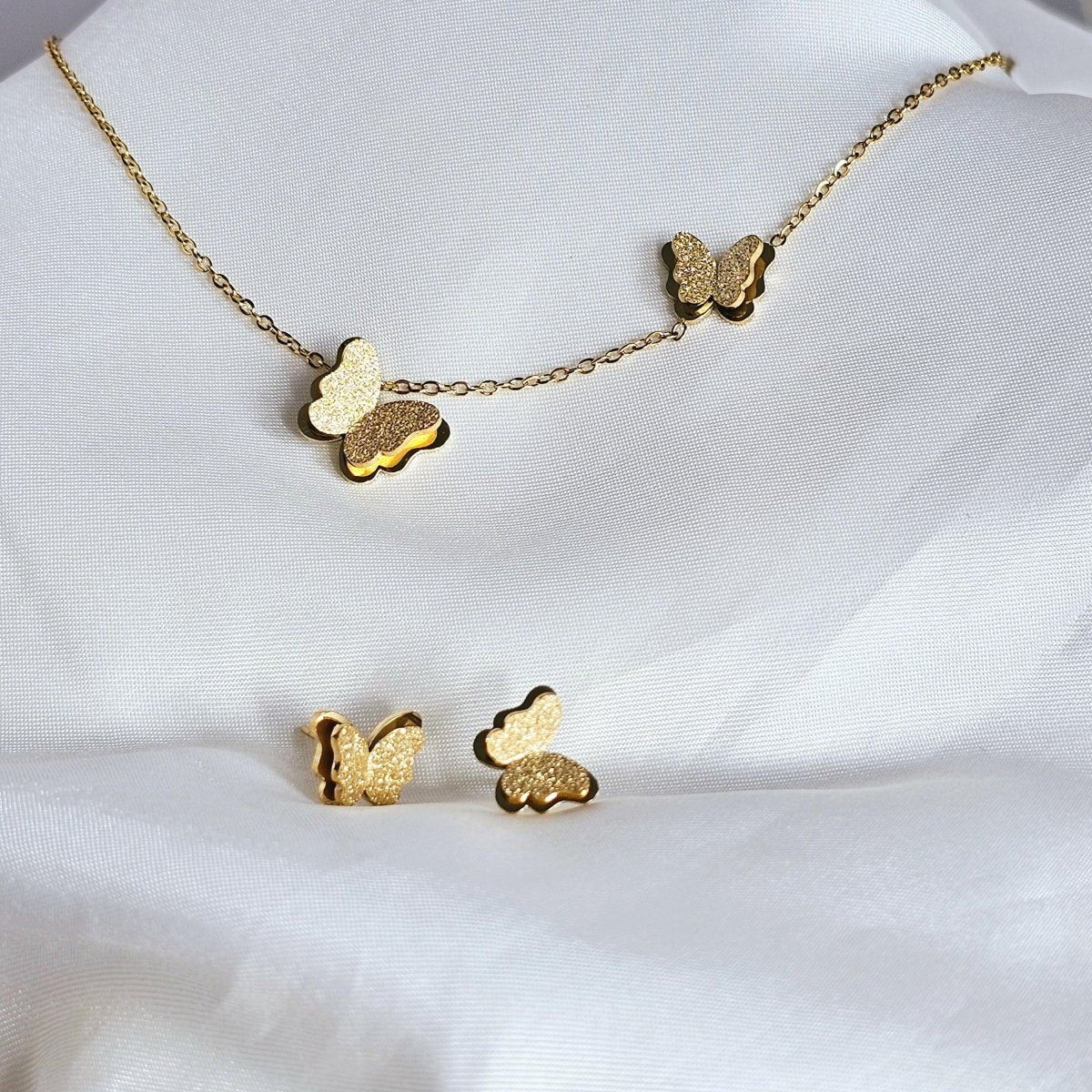 A cute butterfly-themed jewellery set! It features a double-layered design with a sparkly, glittery texture for that eye-catching look. The necklace has an adjustable chain, so you can wear it at just the right length. Plus, it comes with matching stud earrings to complete the set! Perfect for adding a little charm to your everyday style or gifting to someone special!