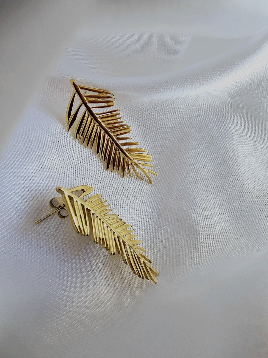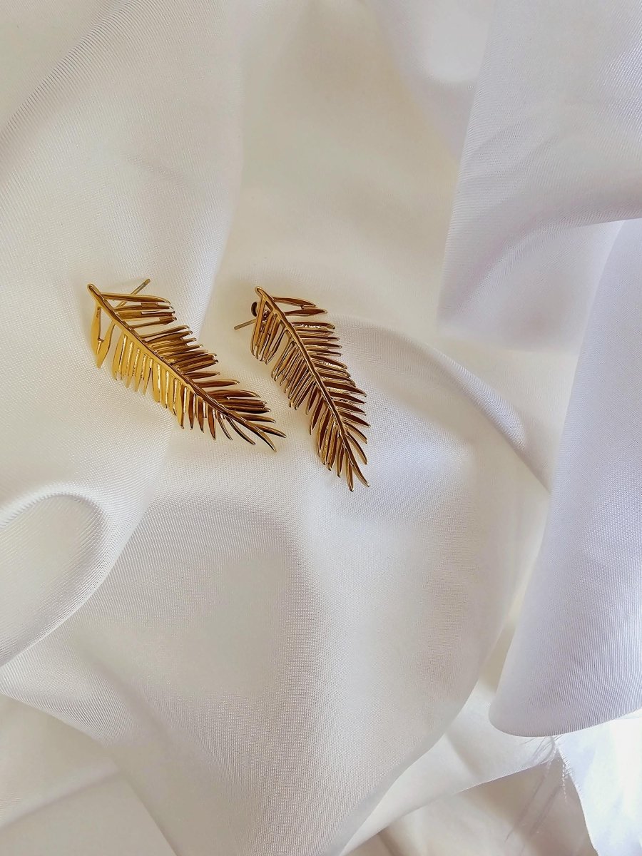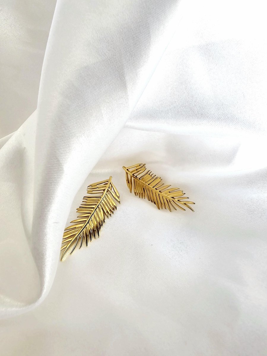 Check out these gorgeous 18k gold statement earrings! With a unique twig large leaf pattern, they add a bold, fuller look to your ears. Plus, they're tarnish-free, so you can rock that stunning shine all day long. Perfect for making a statement without saying a word!