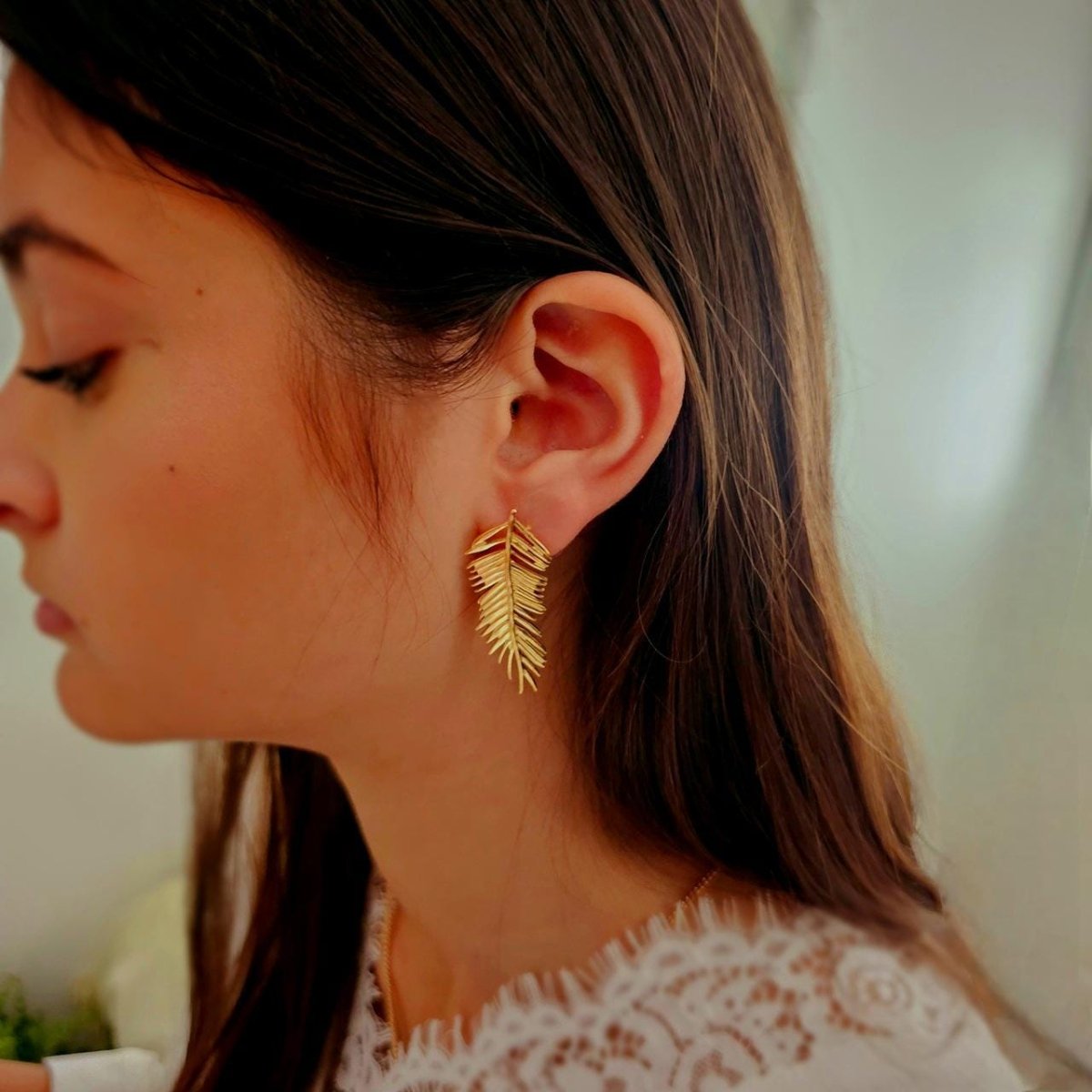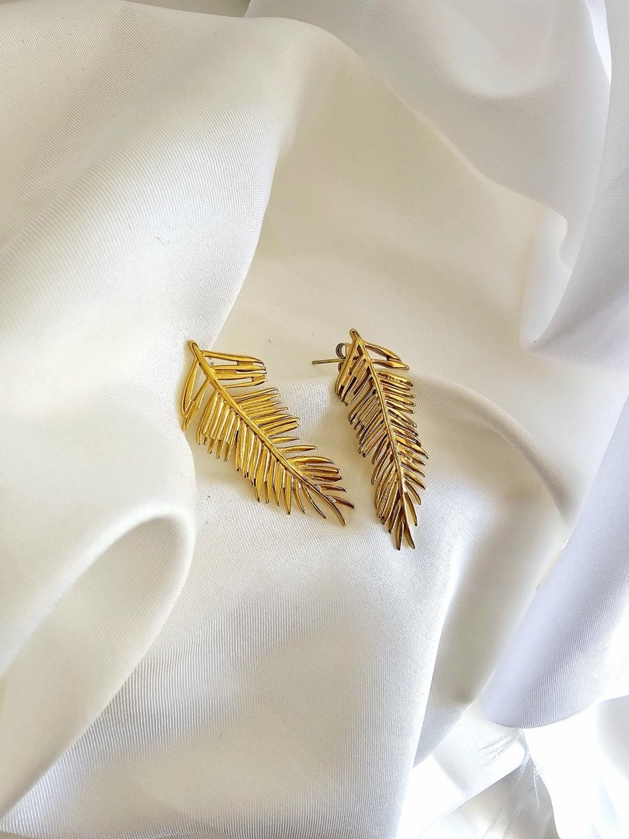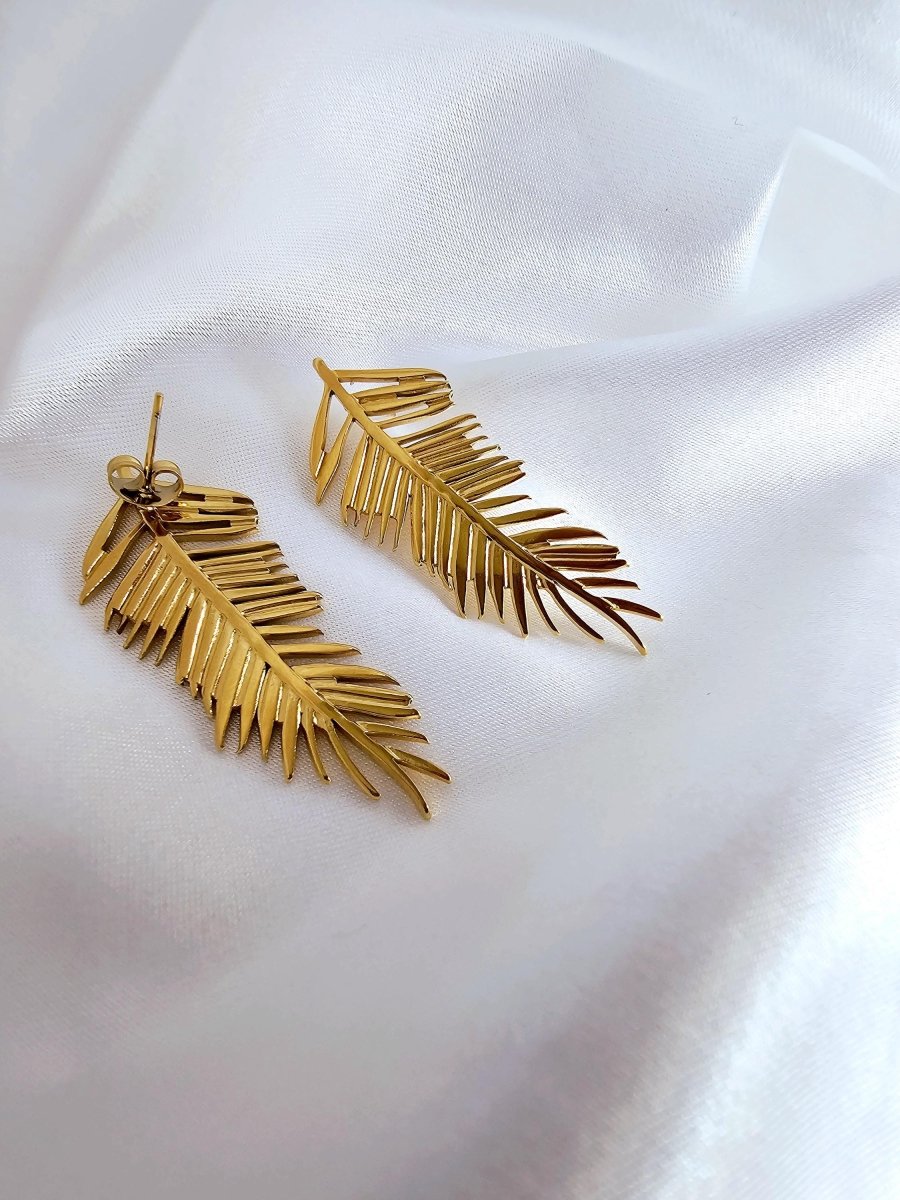 Check out these gorgeous 18k gold statement earrings! With a unique twig large leaf pattern, they add a bold, fuller look to your ears. Plus, they're tarnish-free, so you can rock that stunning shine all day long. Perfect for making a statement without saying a word!