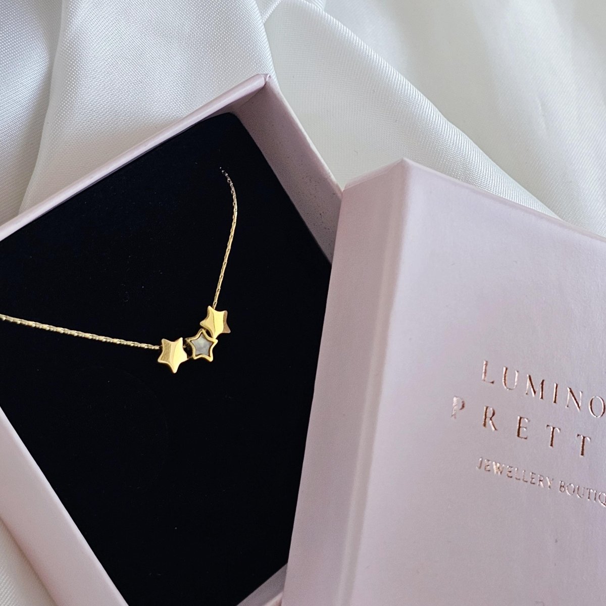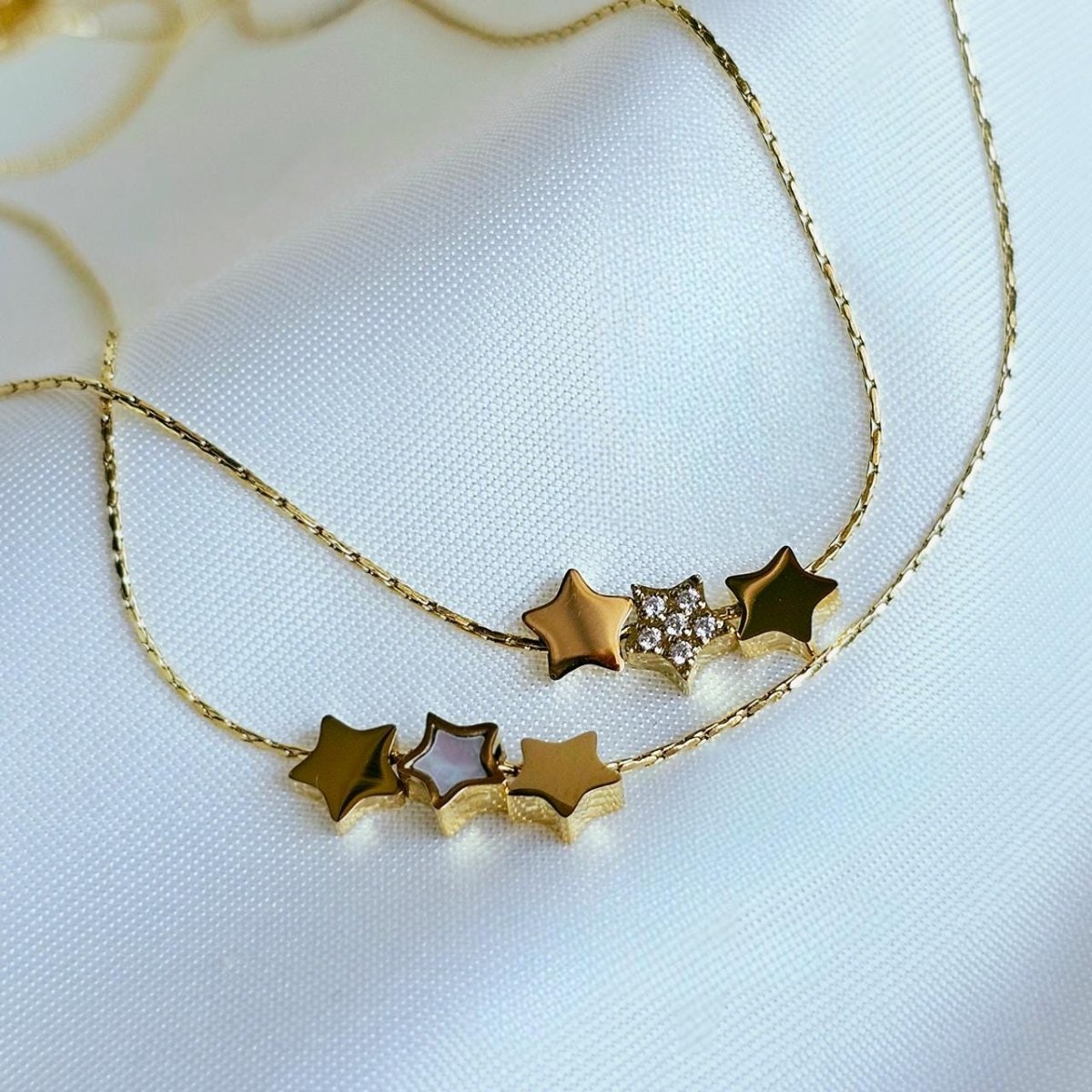 This necklace is all about understated elegance. It's got three dainty star charms floating on an ultra-thin gold chain, giving it that delicate yet chic vibe. The middle star charm is extra special—it’s got a beautiful mother-of-pearl inlay on one side and five tiny cubic zirconia crystals on the other. The best part? You can switch it up depending on how you're feeling, pearl or sparkle! Plus, it’s tarnish-free, so you don’t have to worry about it losing its shine.