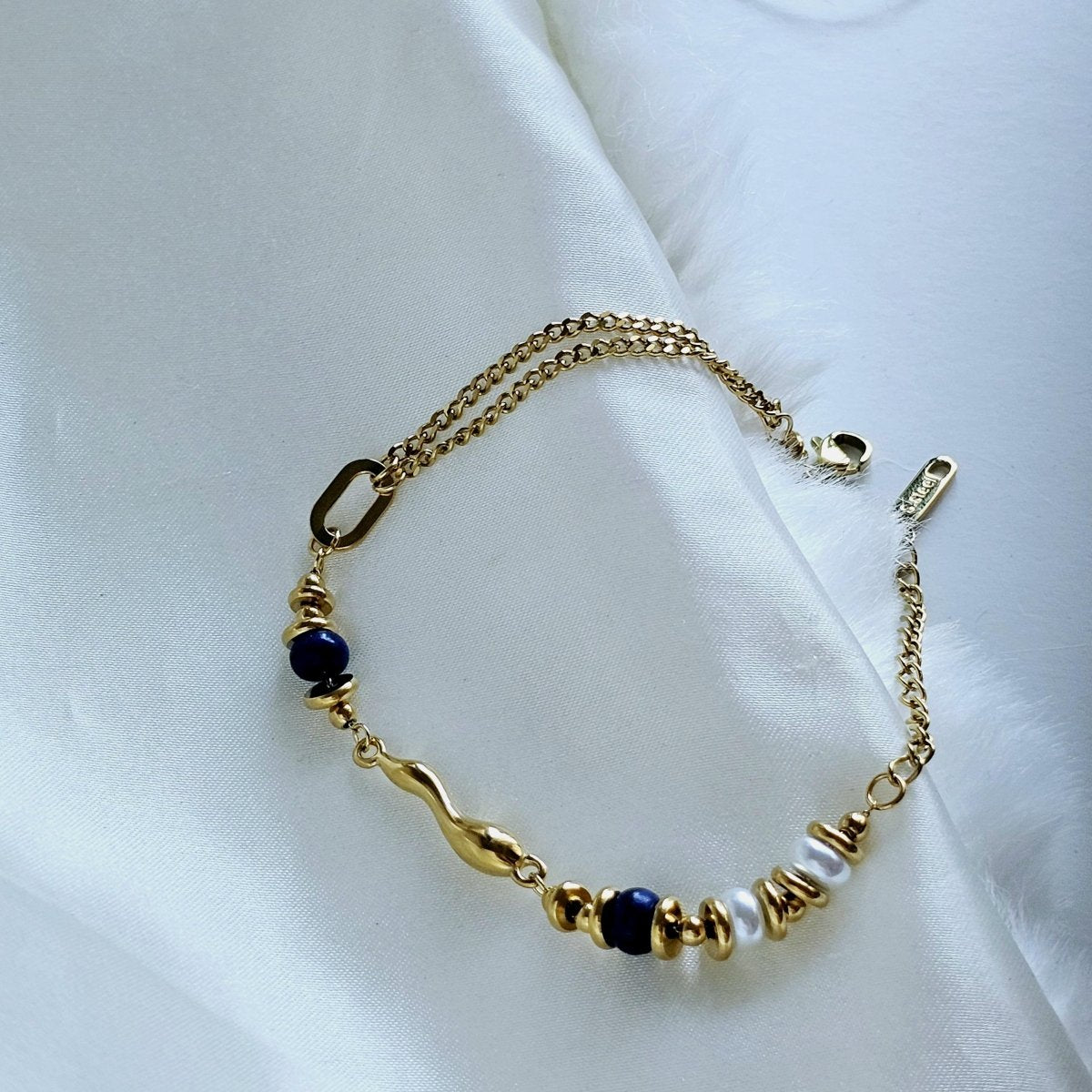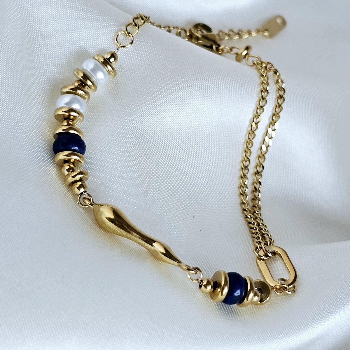 Choose from a Blue bead & Pearl double layered Cuban Chain and a minimalistic round Pearl & Gold chain bracelet. These are the perfect stacking pieces or solo wear.